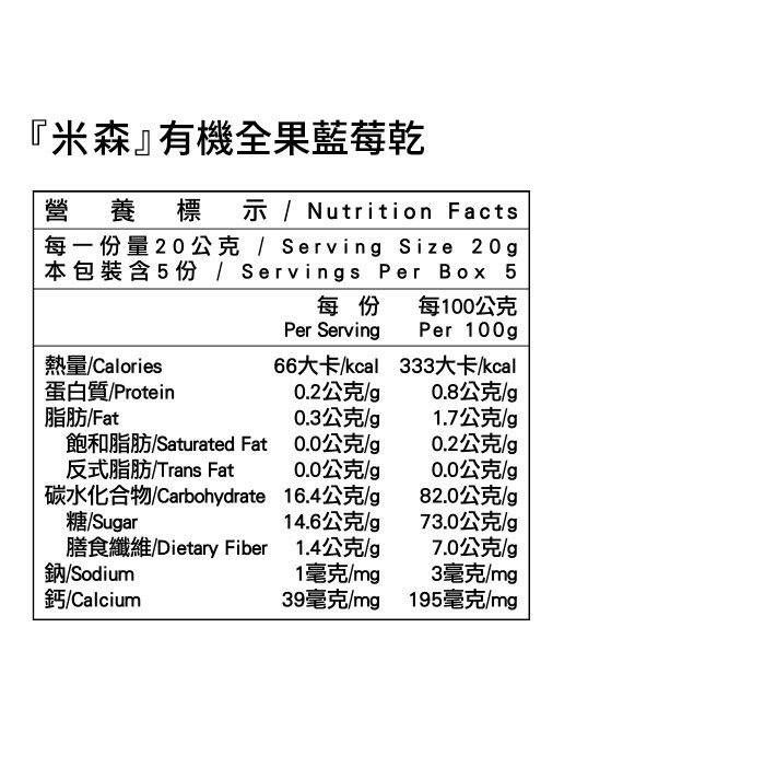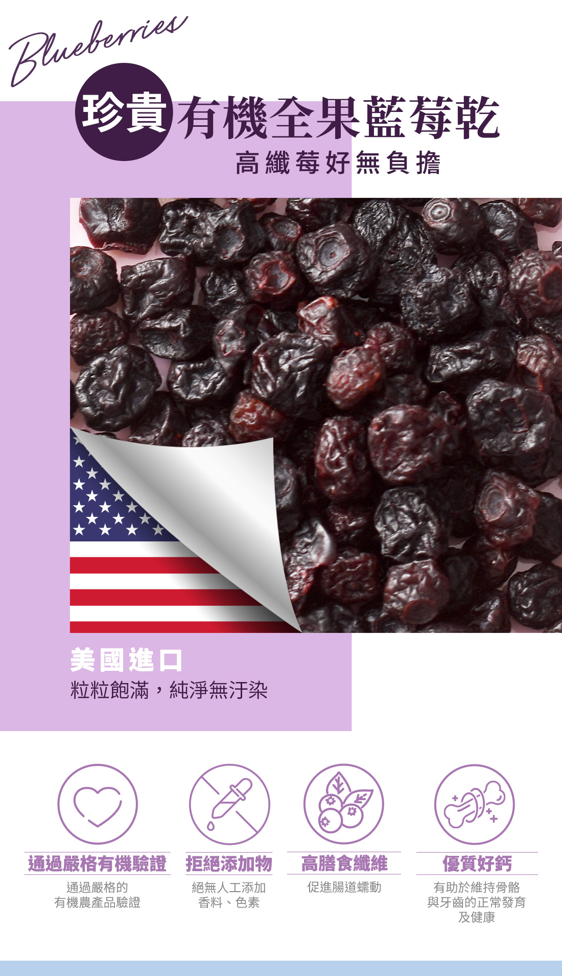 原料:有機藍莓乾(有機藍莓、有機砂糖、有機葵花油)