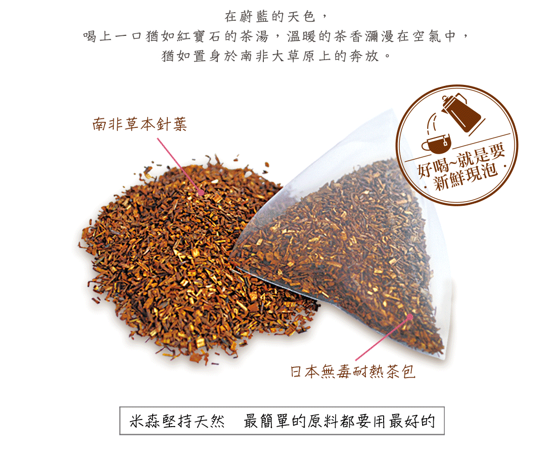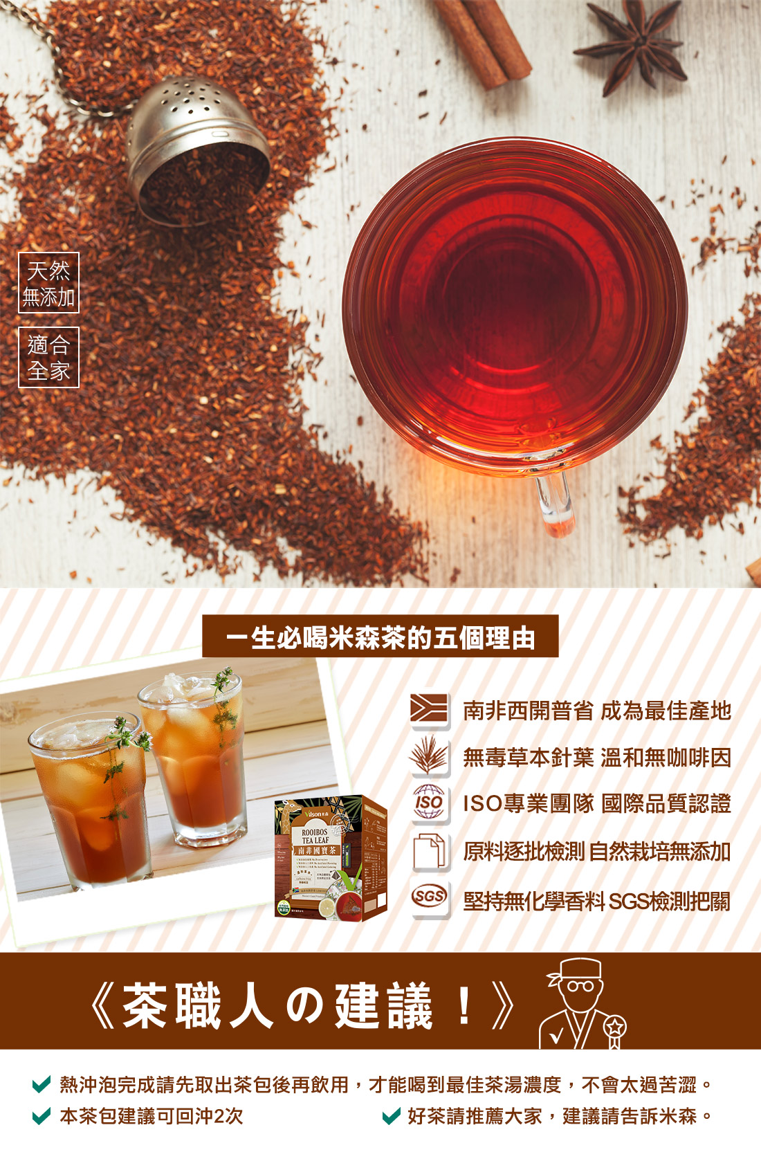 米森特選來自茶園的原片針葉進行製作,其果香加倍濃郁,不苦澀,當地人更稱其為南非紅寶石。 其生產的國寶茶具有香醇濃郁的果香及琥珀色澤的茶湯,且不含咖啡因更適合長期溫和飲用。是值得您和家人一同品嘗的好茶。