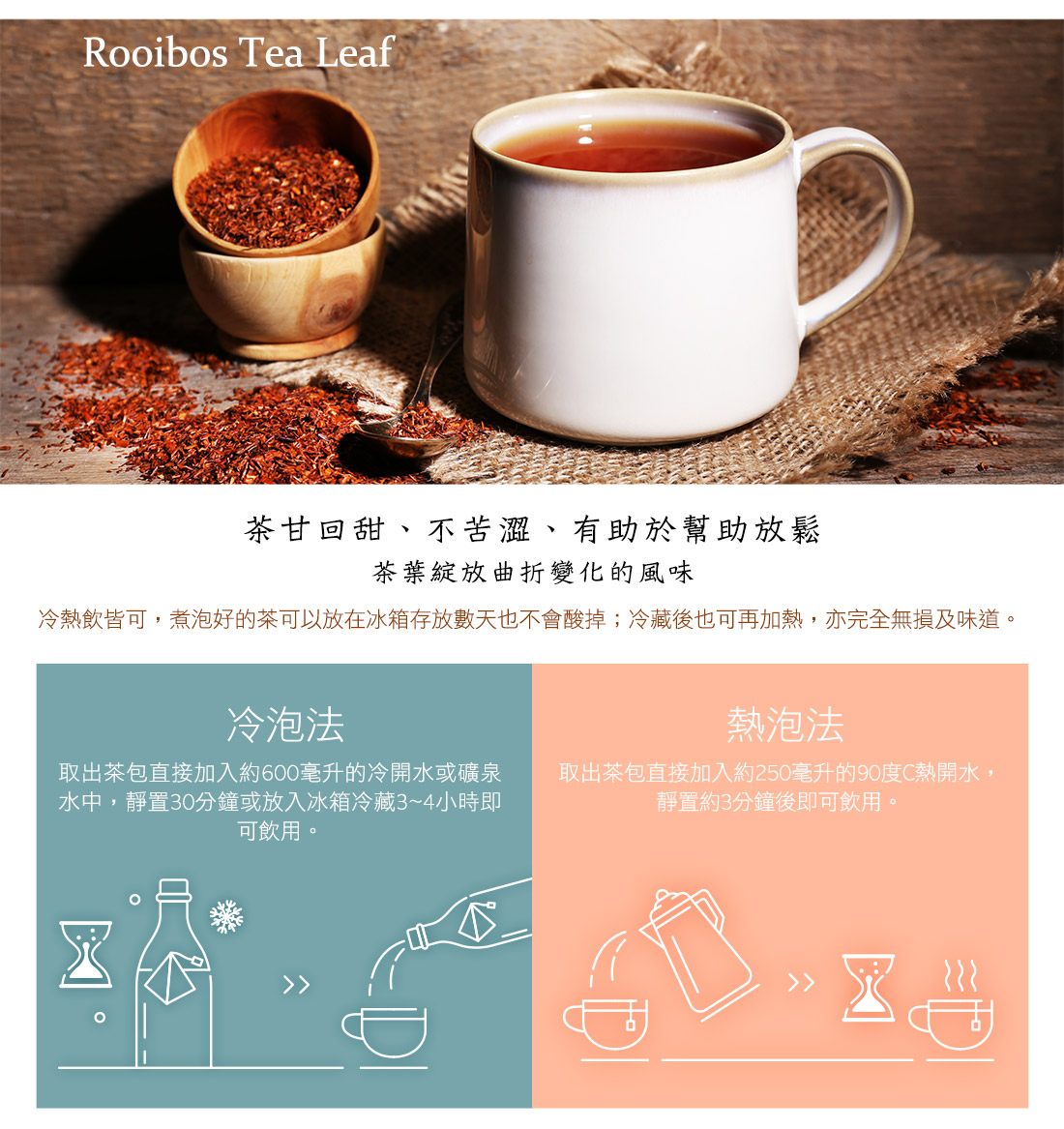取出茶包直接加入約600毫升的冷開水或礦泉水中,靜置30分鐘或放入冰箱冷藏3~4小時即可飲用。