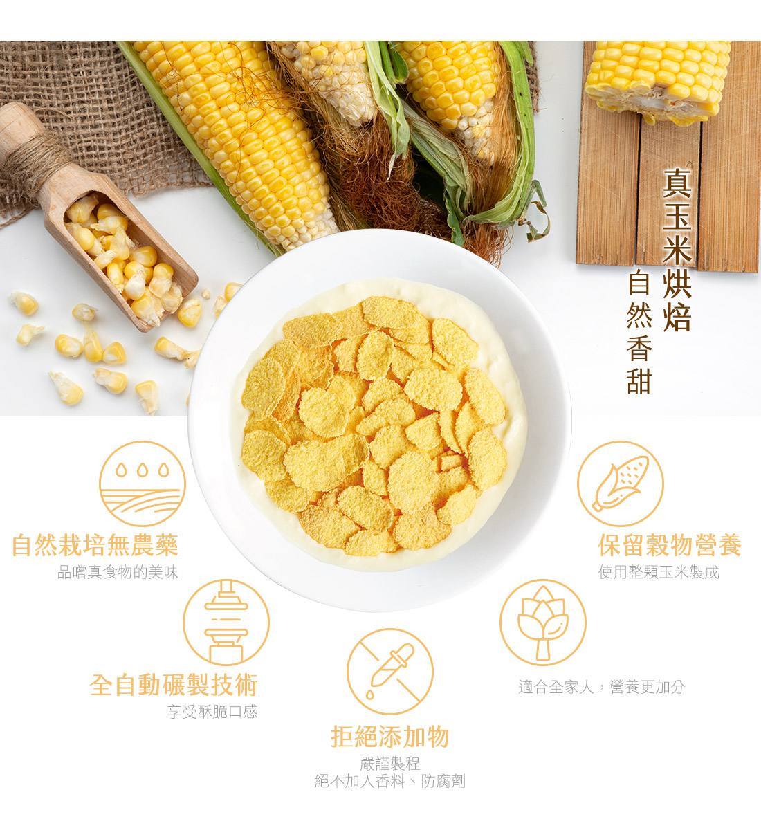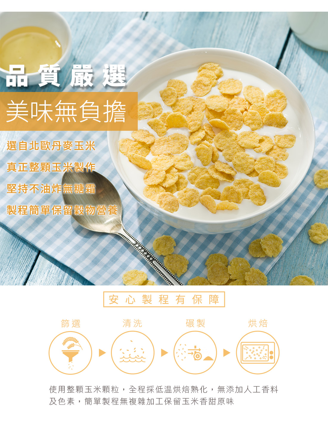 米森嚴選來自丹麥純淨的玉米片,讓你享受真食物的美味;並以整顆全穀玉米進行壓製,