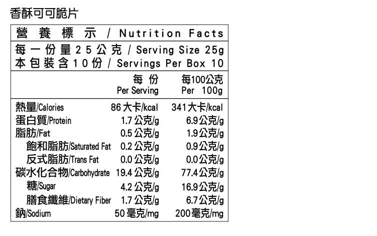 原料:可可脆片(穀粉(玉米粉(非基因改造)、小麥粉、米粉)、砂糖、低脂可可粉、米糖漿、鹽、肉桂粉)