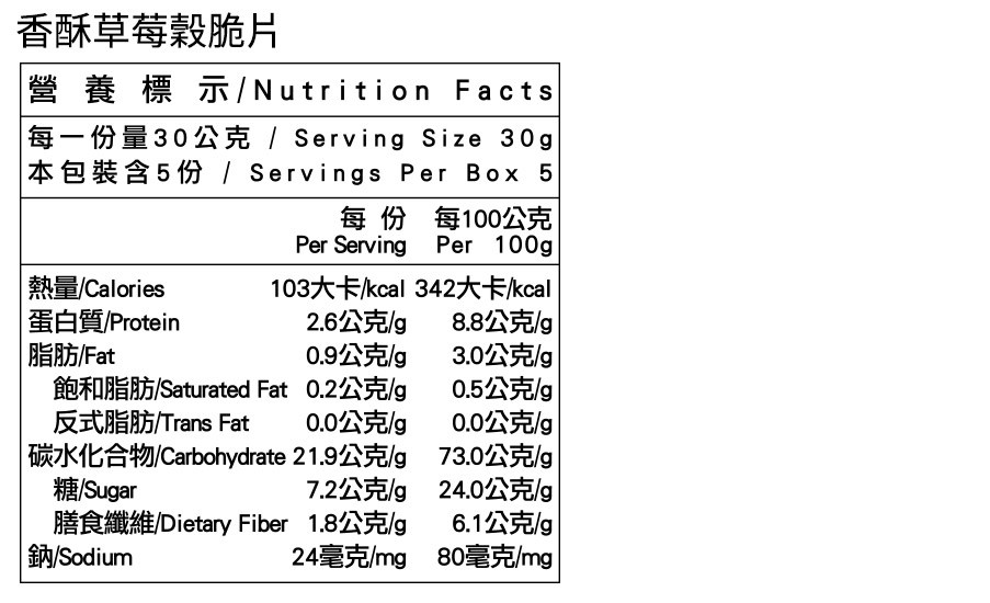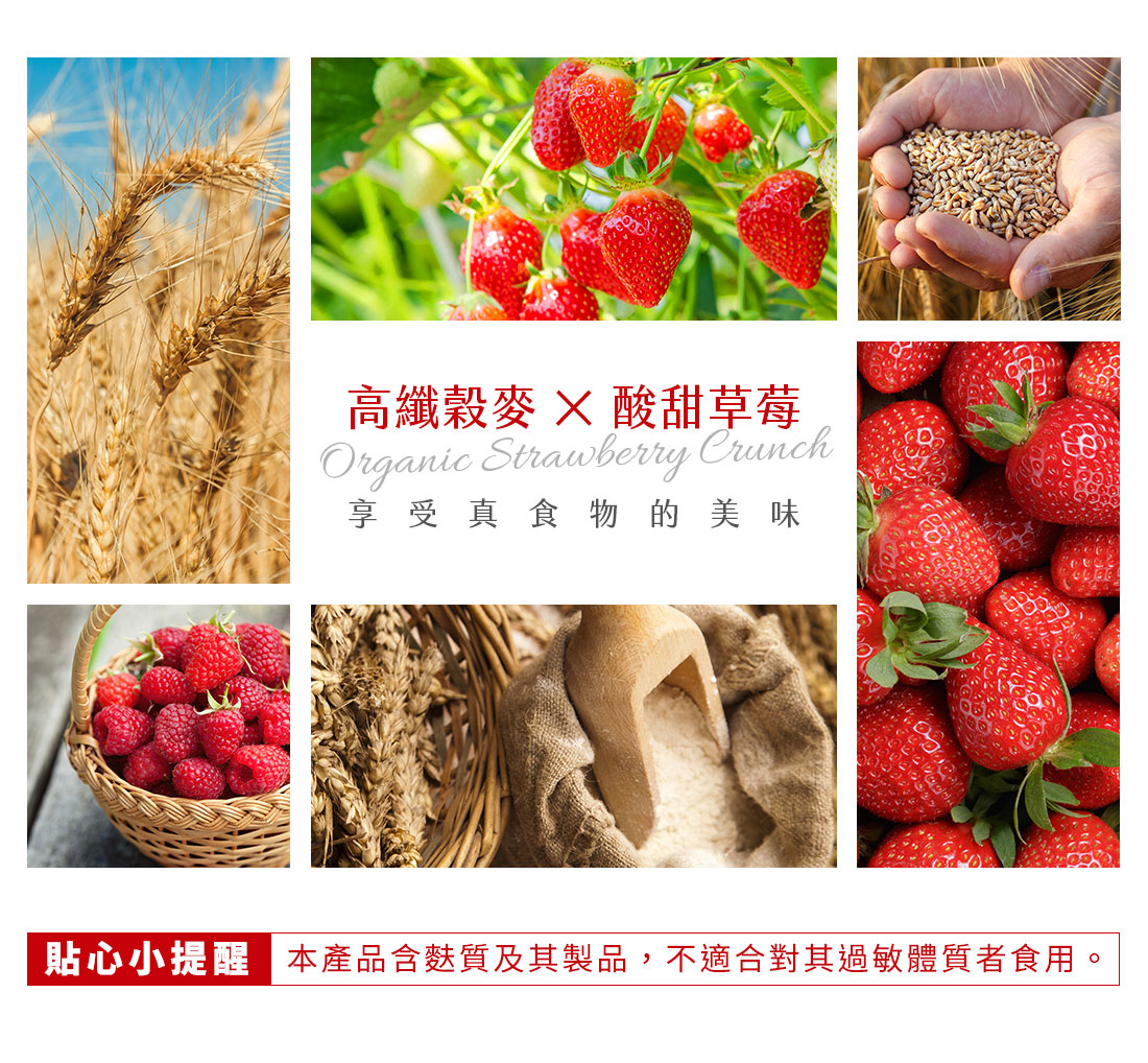 原料:草莓穀脆片(全麥麵粉、小麥粉、糖、草莓片、草莓粒、草莓粉、葡萄糖、覆盆莓粉、油菜籽油、鹽)