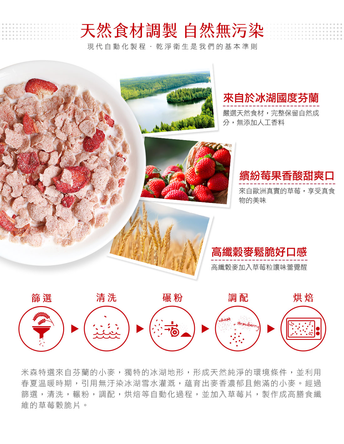 米森與芬蘭跨國共同研發超酥脆口感的穀脆片,保留高膳食纖維,再加入來自歐洲的草莓片,口感酸甜,爽口不油膩,顛覆你對穀脆片的想像,每一口都能嘗得到真食物的好滋味!