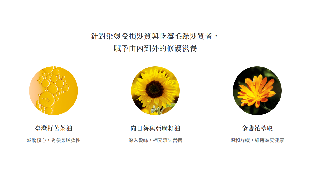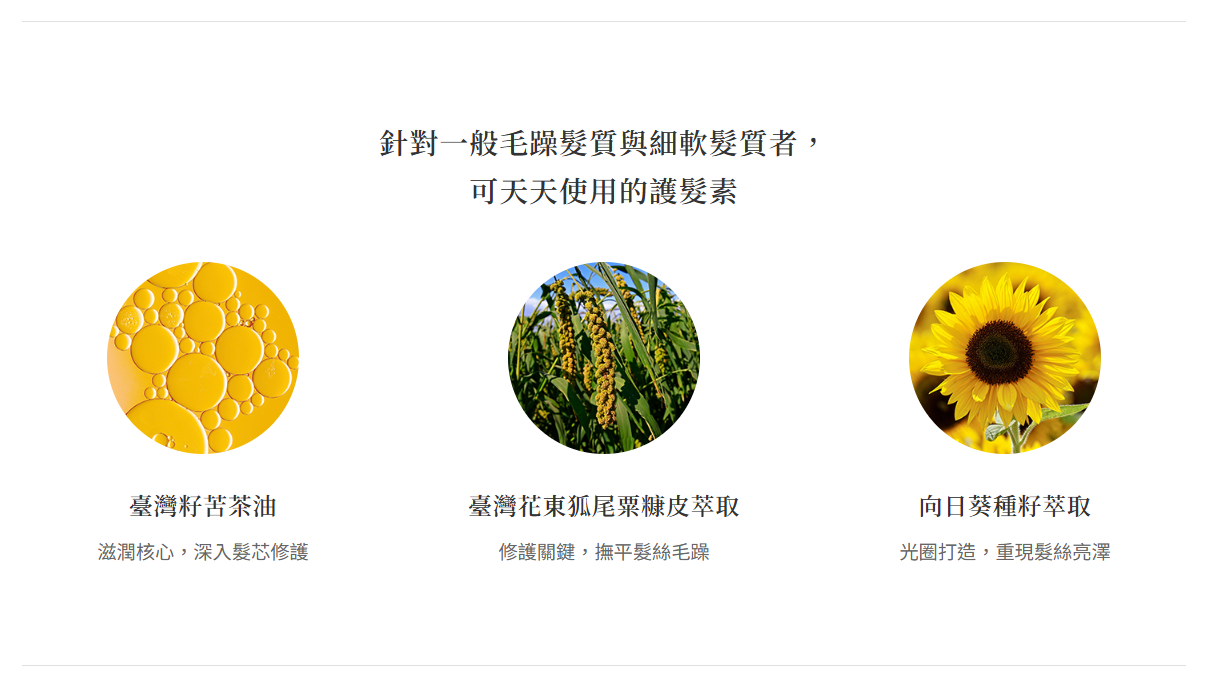 • 臺灣籽苦茶油、臺灣花東狐尾粟糠皮萃取、向日葵種籽萃取|撫平毛鱗片,修護柔順提升彈性