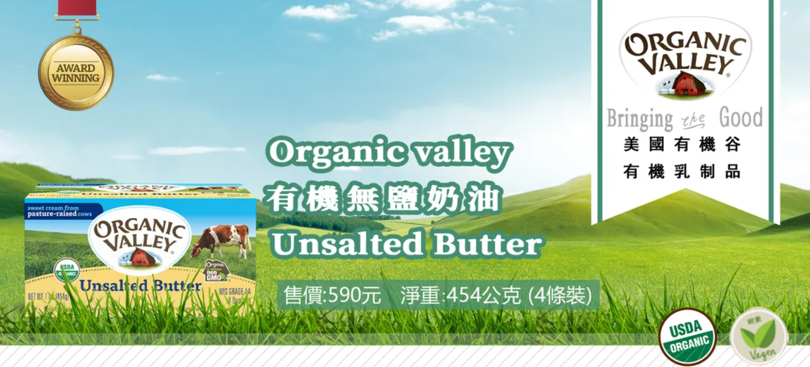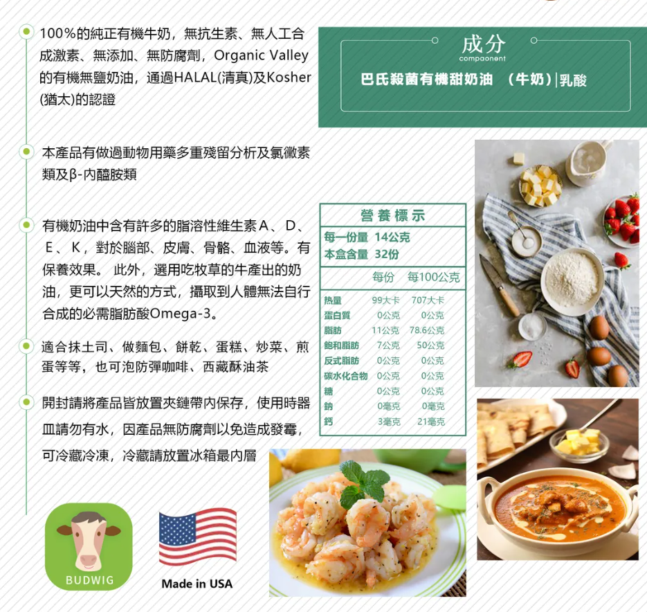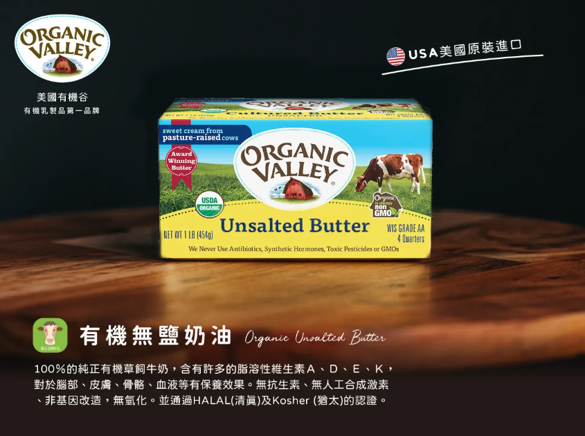 美國第一大品牌原裝進口有機無鹽草飼奶油,本產品100%純正有機牛奶製造,無添加任何人工香料調味劑,以及人工色素添加劑,非基因改造,無防腐劑,奶素皆可食用