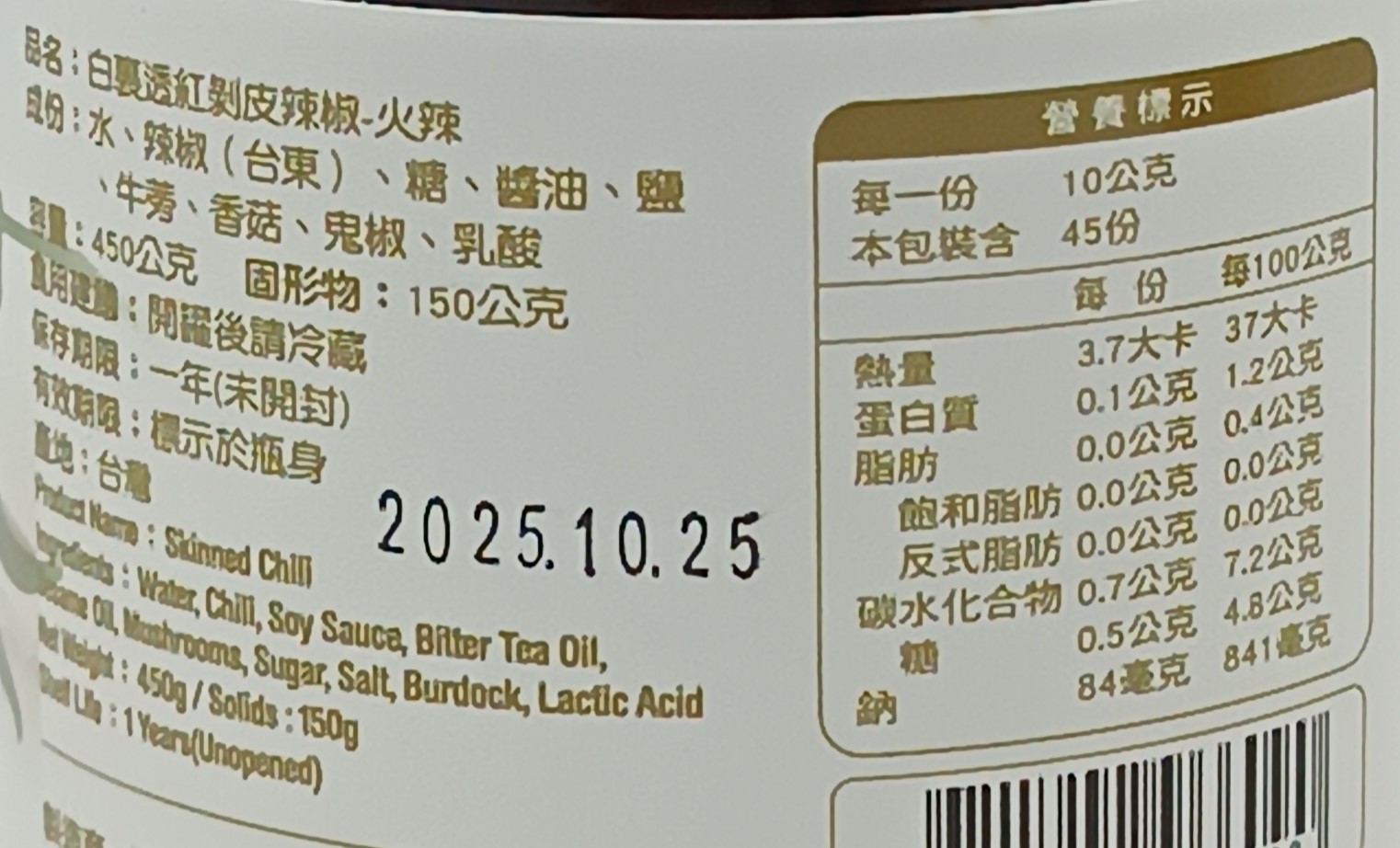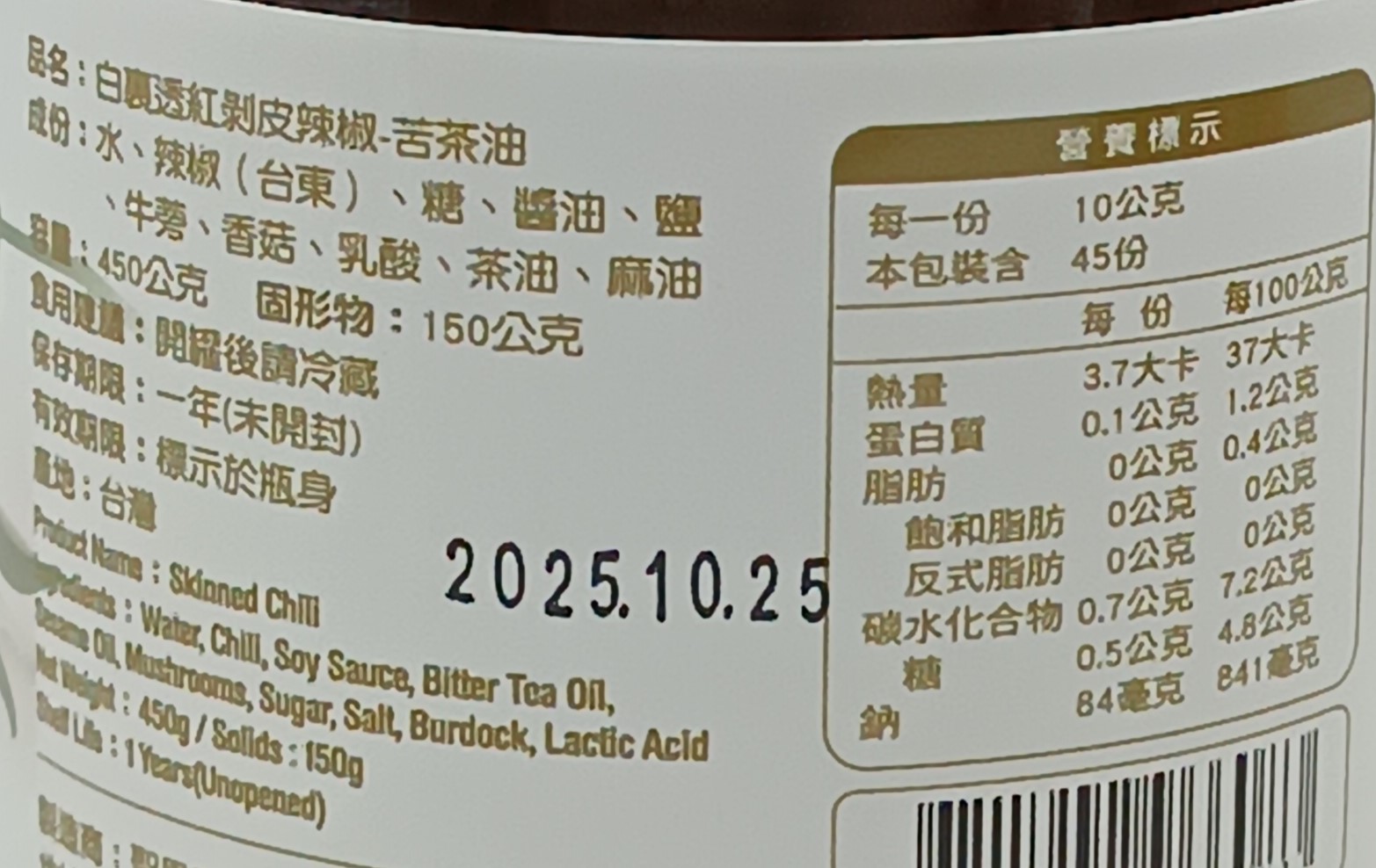 成份:辣椒、水、醬油、茶油、牛蒡、香菇、糖、鹽、乳酸