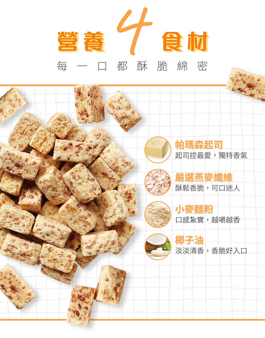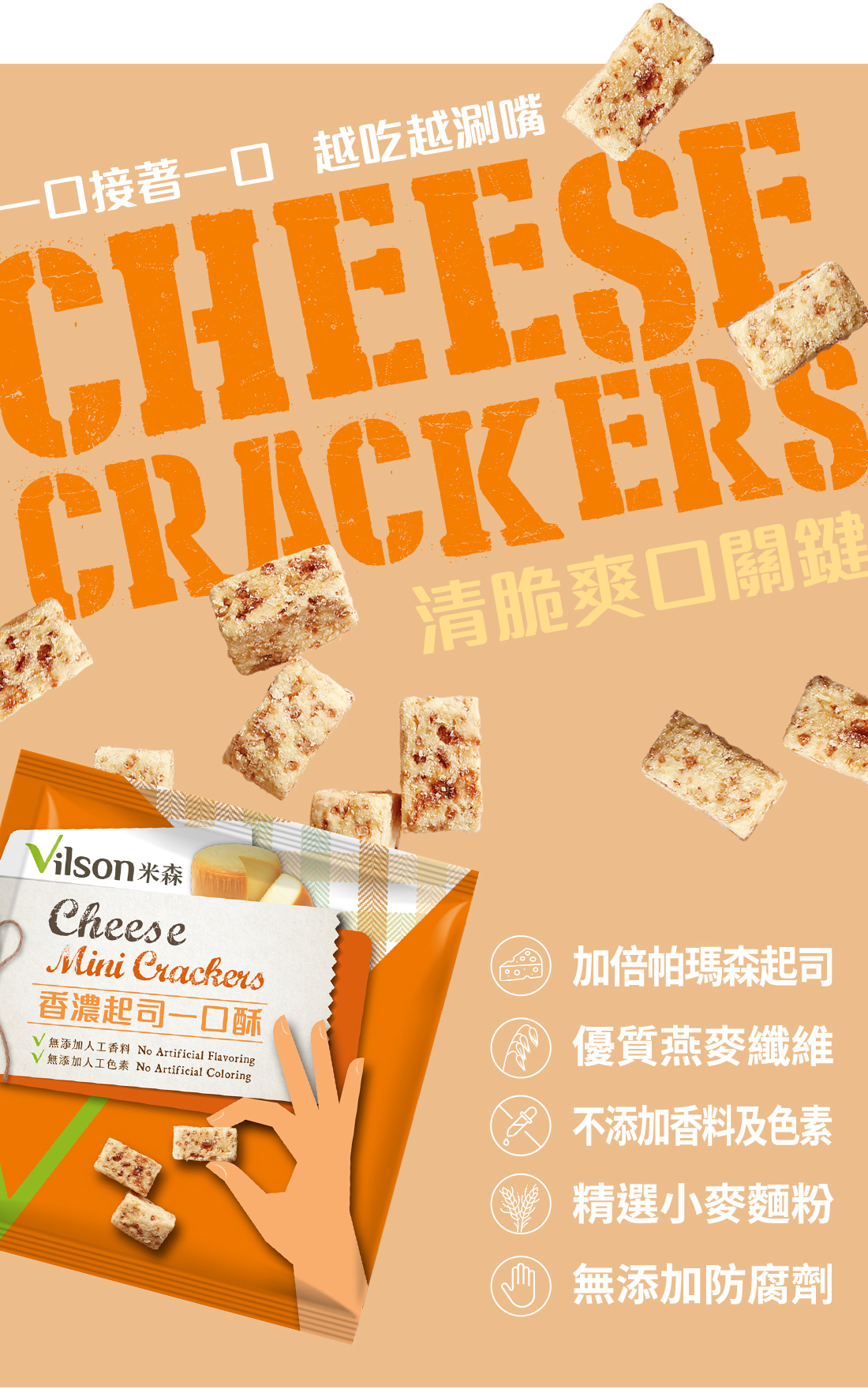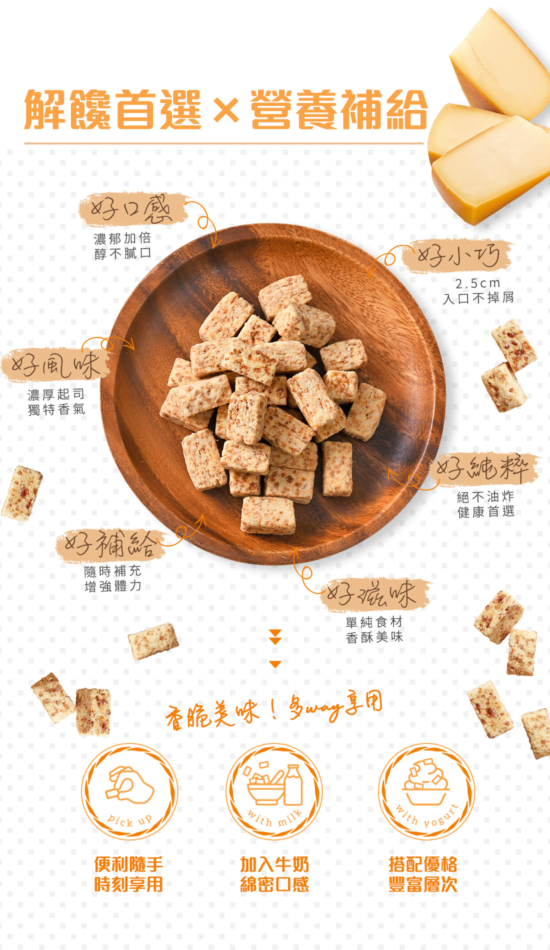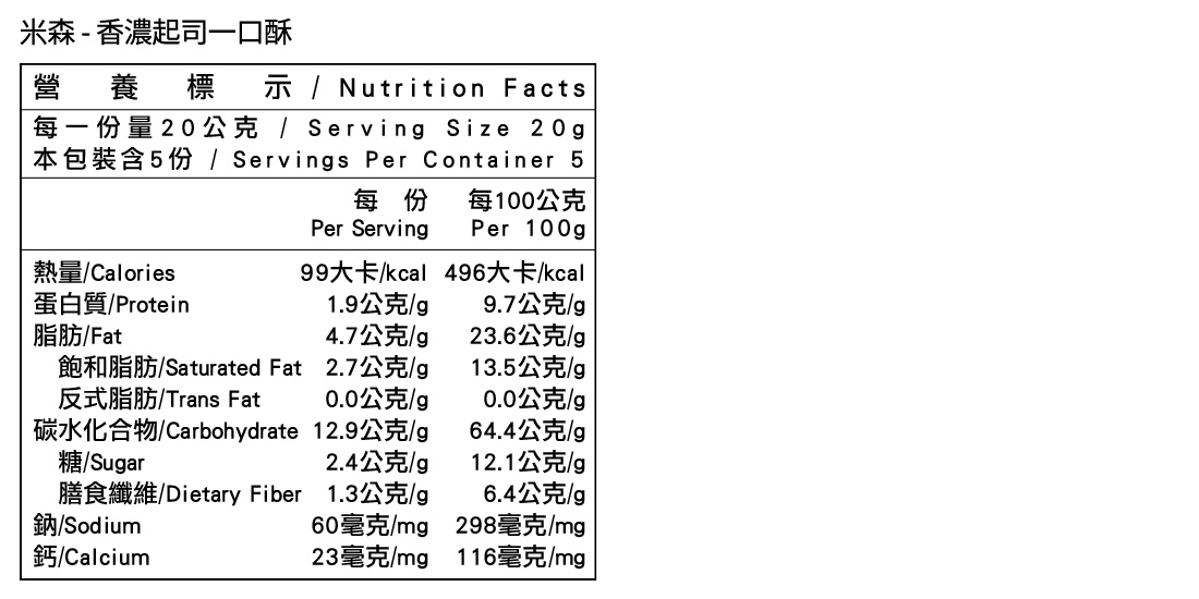 『米森』與台灣本土餅乾大廠合作,以香濃帕馬森起司為基底,經過多次配方調整,並以專業烘焙技術完美結合香濃起司與燕麥纖維,全程無添加人工香料與色素,打造出口感與營養兼具的香濃起司一口酥,搭配便利隨手包,每一口都是濃郁起司香x酥脆綿密的雙重享受!