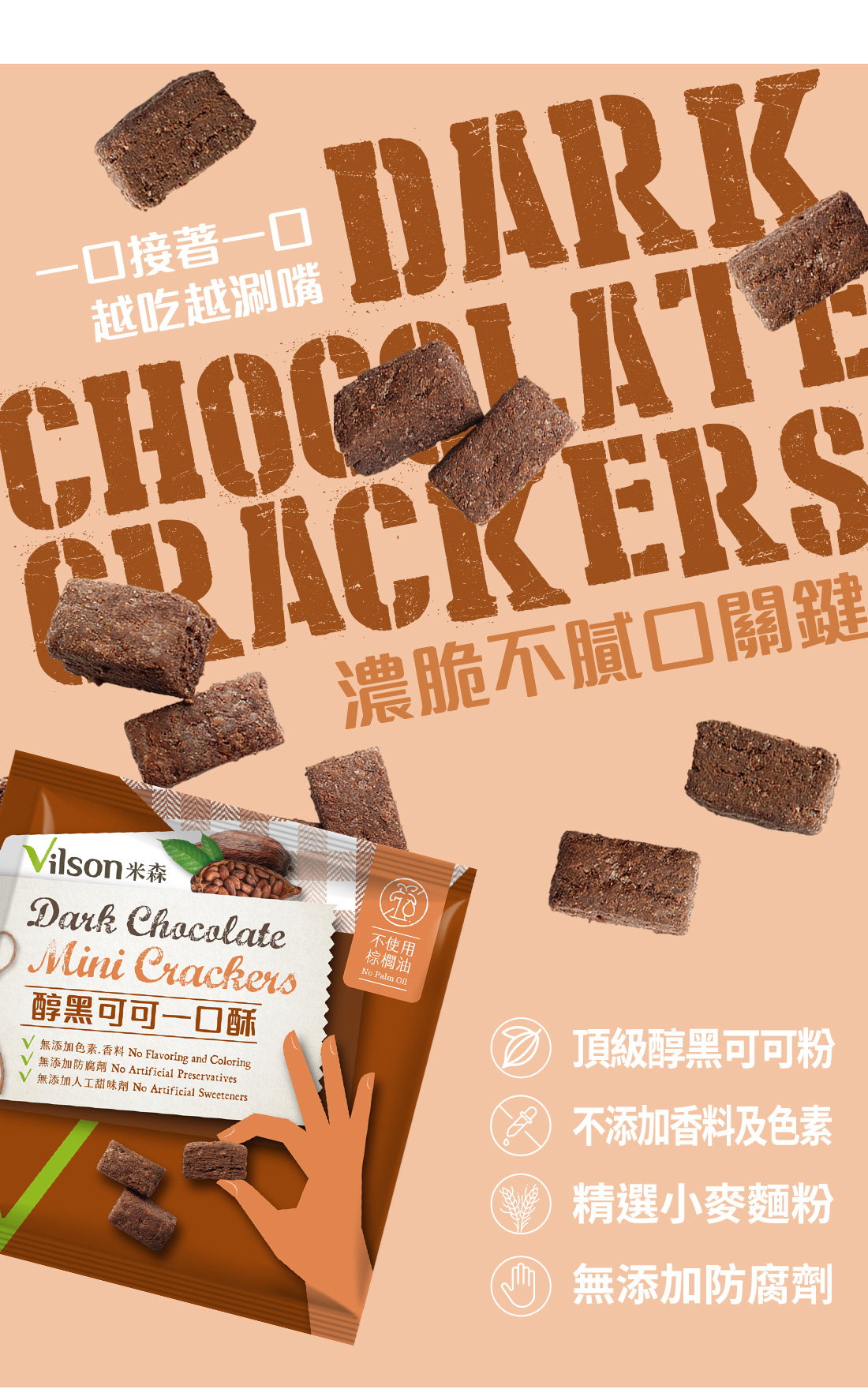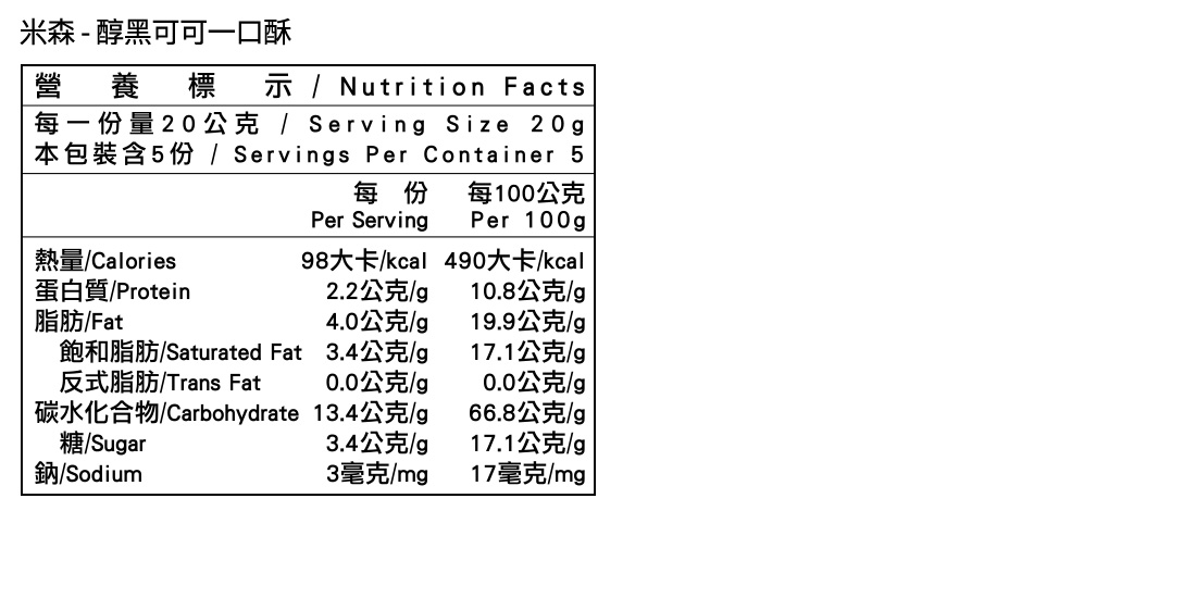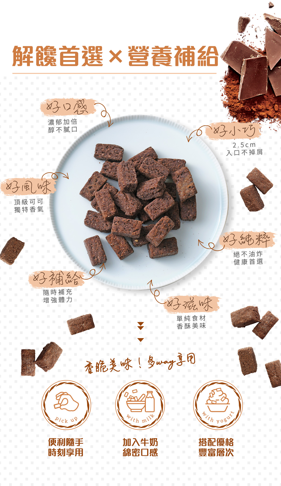 『米森』與台灣本土餅乾大廠合作,以香氣濃郁的高脂可可粉為基底,經過多次配方調整,設計出完美一口不掉屑的尺寸,全程無添加人工香料、色素及甜味劑,堅持使用椰子油取代棕櫚油,打造出口感與營養兼具的醇黑可可一口酥,搭配便利隨手包,每一口都是停不下來的雙重享受!