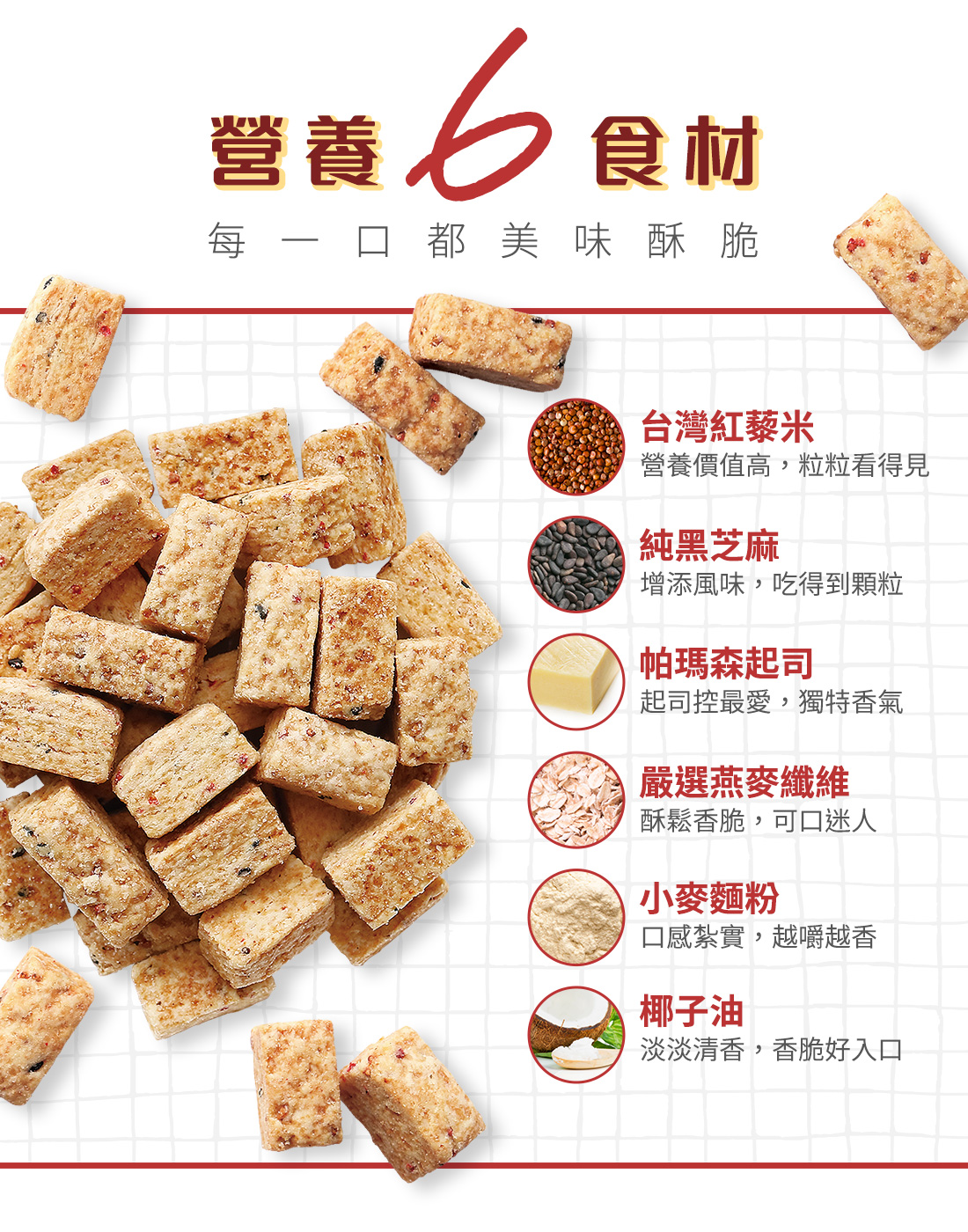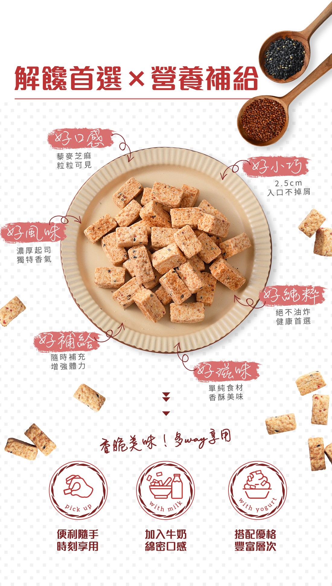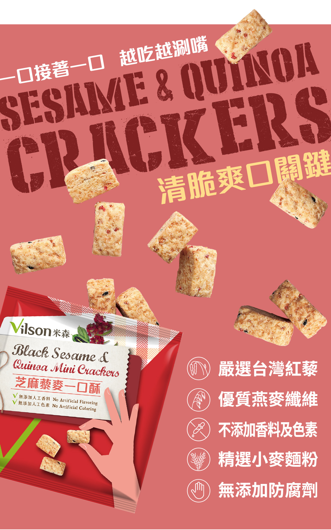 『米森』與台灣本土餅乾大廠合作,以香濃芝麻與台灣紅藜為基底,經過多次配方調整,並以專業烘焙技術完美結合芝麻、紅藜與燕麥纖維,全程無添加人工香料與色素,打造出口感與營養兼具的芝麻藜麥一口酥,搭配便利隨手包,每一口都是停不下來的雙重享受!