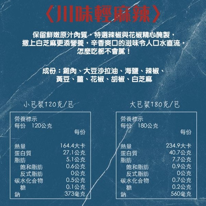 成份:雞肉、大豆沙拉油、海鹽、乾辣椒、花椒、青花椒、郫縣豆瓣醬(鮮紅辣椒、蠶豆、鹽、小麥粉)、香辛料、白芝麻