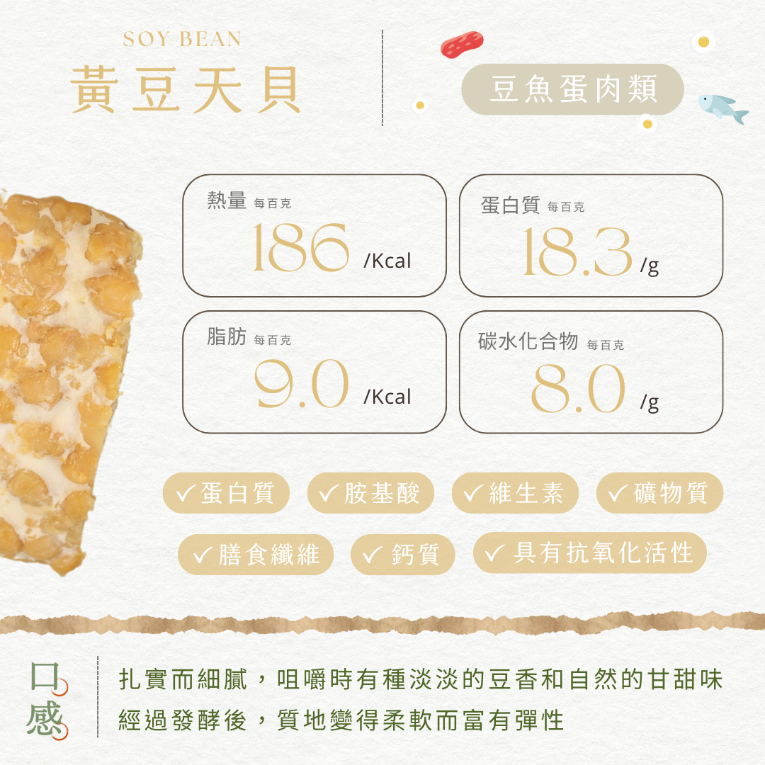 天貝是由豆類與天貝菌發酵而成的 ,完整的保留黃豆大部分的營養價值