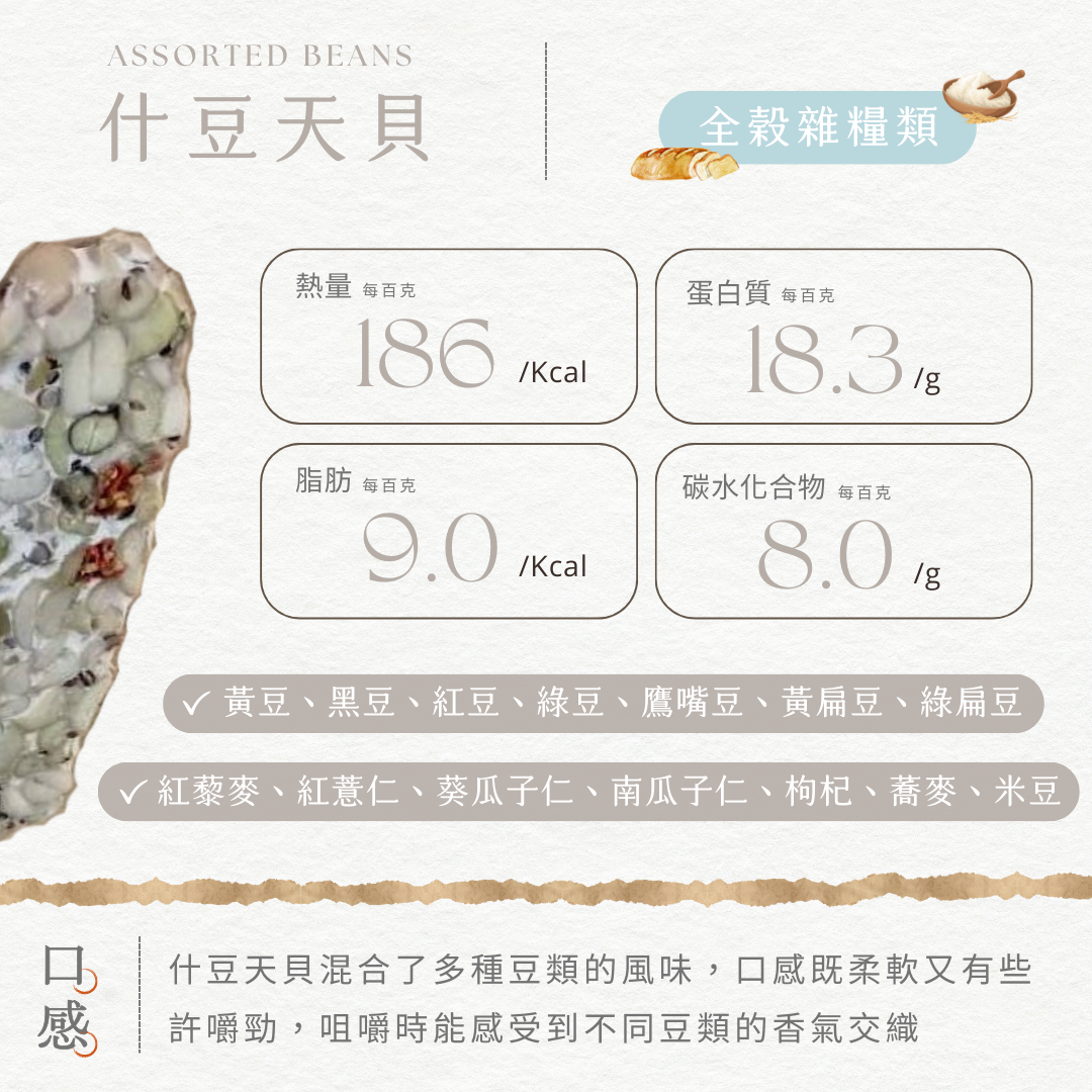 成 份:什豆(加拿大非基改黃豆、黑豆、紅豆、綠豆、枸杞、鷹嘴豆、紅藜麥、黃扁豆、綠扁豆、米豆、蕎麥、紅薏仁、葵瓜子仁、南瓜子仁)、天貝菌、糯米醋