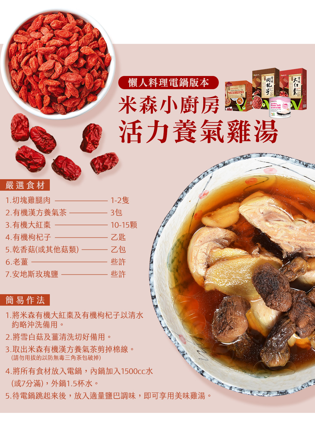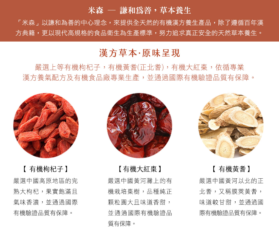 米森以高效率養生為中心理念,提供全天然的有機漢方養生產品。 嚴選上等有機枸杞子,有機黃耆(正北耆),有機大紅棗,依循專業漢方養氣配方,不用經由熬煮,即可隨沖即飲,隨時享用漢方飲品,及採用有機食品廠專業生產,安心有保障 ,並通過國際有機驗證品質有保障。