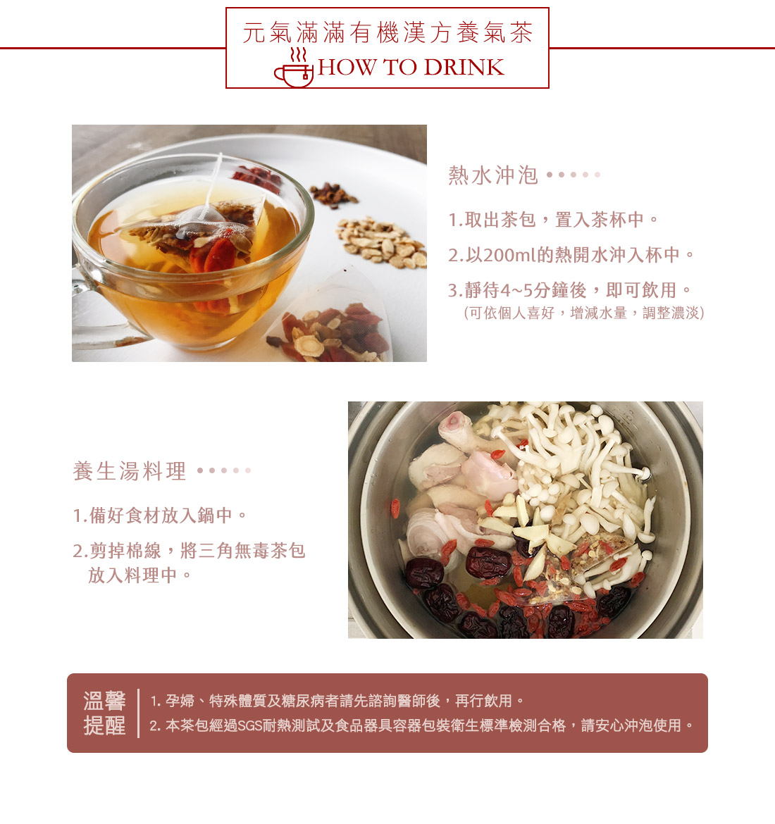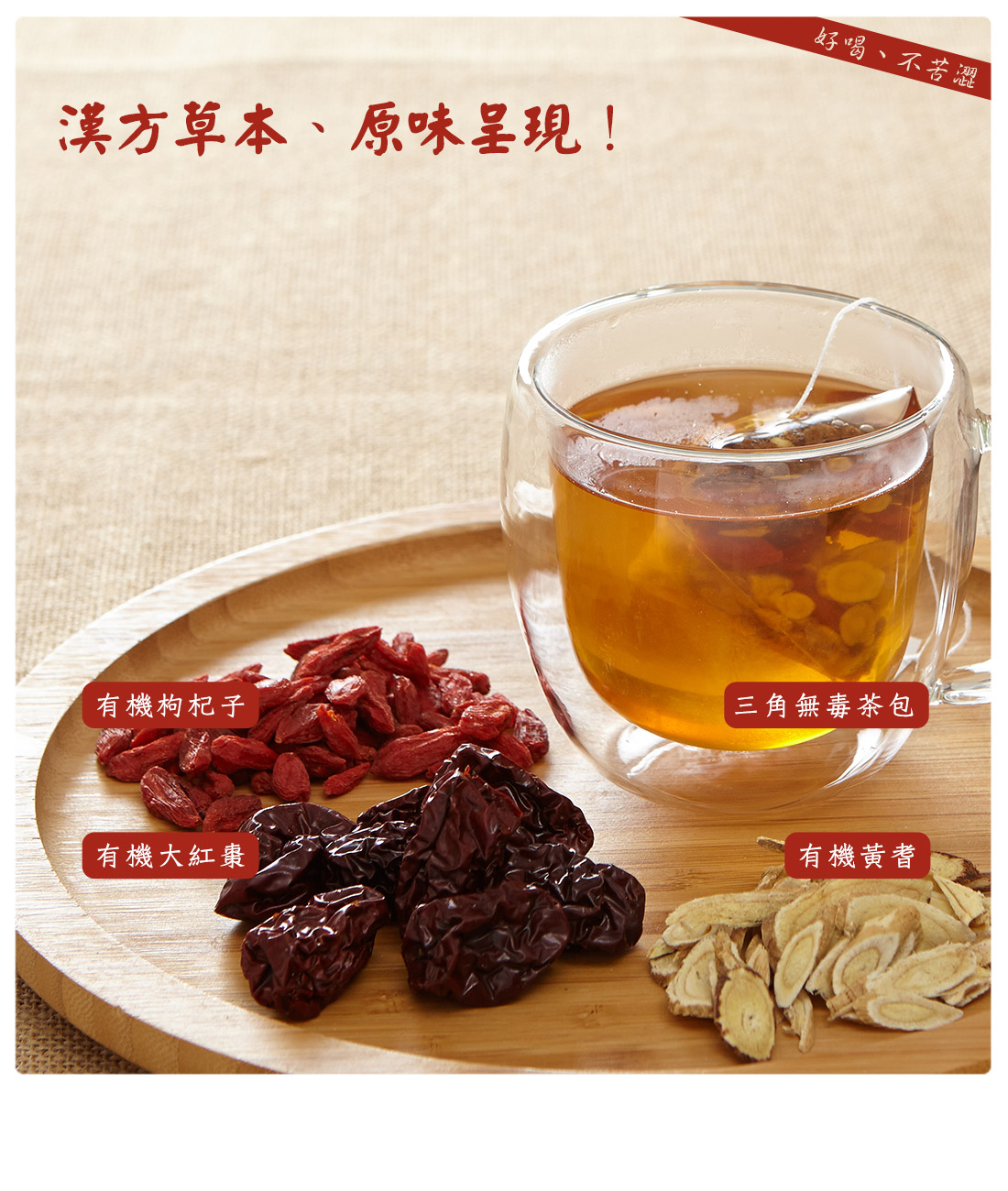 原料:有機黃耆(中國)、有機枸杞子(中國)、有機大紅棗(中國)