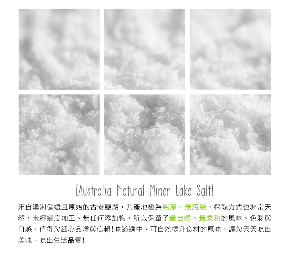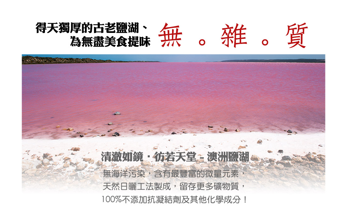 來自澳洲偏遠且原始的古老鹽湖,其產地極為純淨、無污染,採取方式也非常天然,未經過度加工、無任何添加物,所以保留了最自然、最柔和的風味、色彩與天然成份,值得您細心品嚐與信賴!