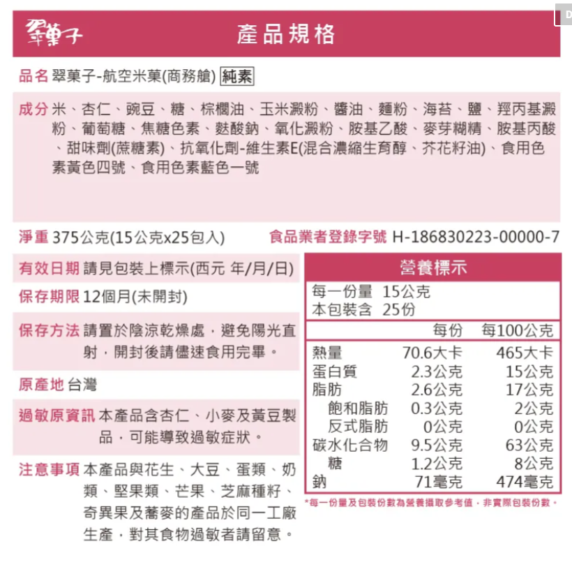 內容物:調味杏仁、翠菓子原味豆、柿種米菓、海苔捲