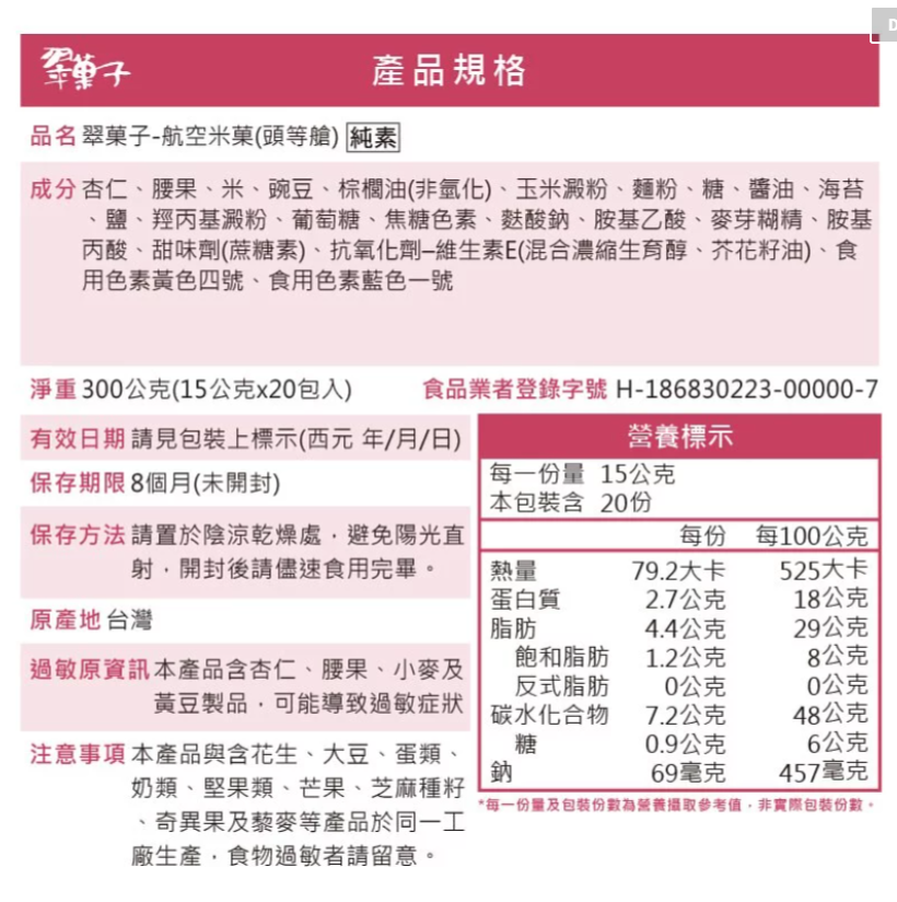 內容物:調味杏仁、調味腰果、海苔捲、翠菓子原味豆