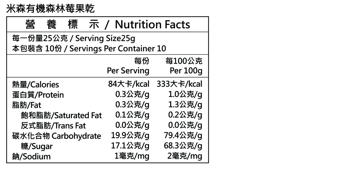 成份:有機葡萄乾(有機葡萄乾、有機葵花油)(美國)、有機切片蔓越莓乾(有機蔓越莓、有機糖、有機葵花油)(加拿大)、有機藍莓乾(有機藍莓、有機砂糖、有機葵花籽油)(加拿大)