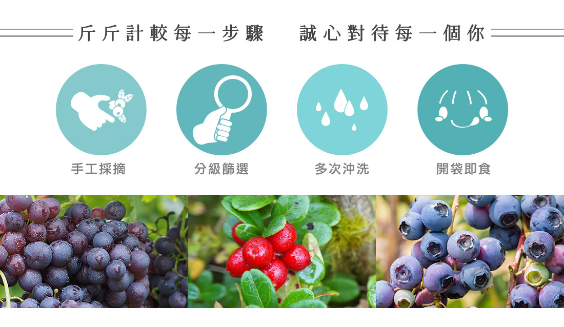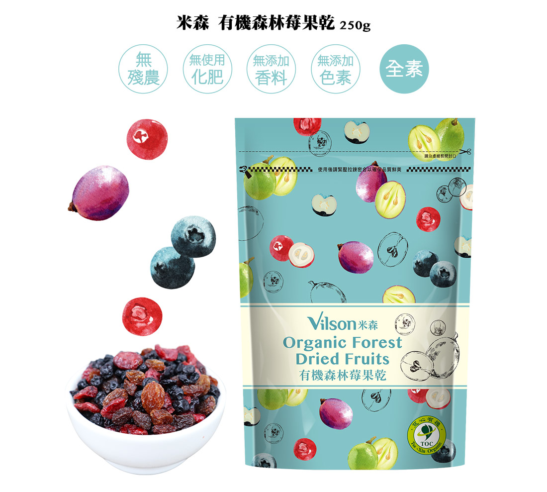 米森精選顆顆飽滿的有機葡萄乾,酸中帶甜的有機蔓越莓乾,及自然清香的有機藍莓乾,讓你每一口都吃得到層次不同的果香味。農場全程不使用農藥的有機栽種方式,且通過國際有機驗證,品質有保證。