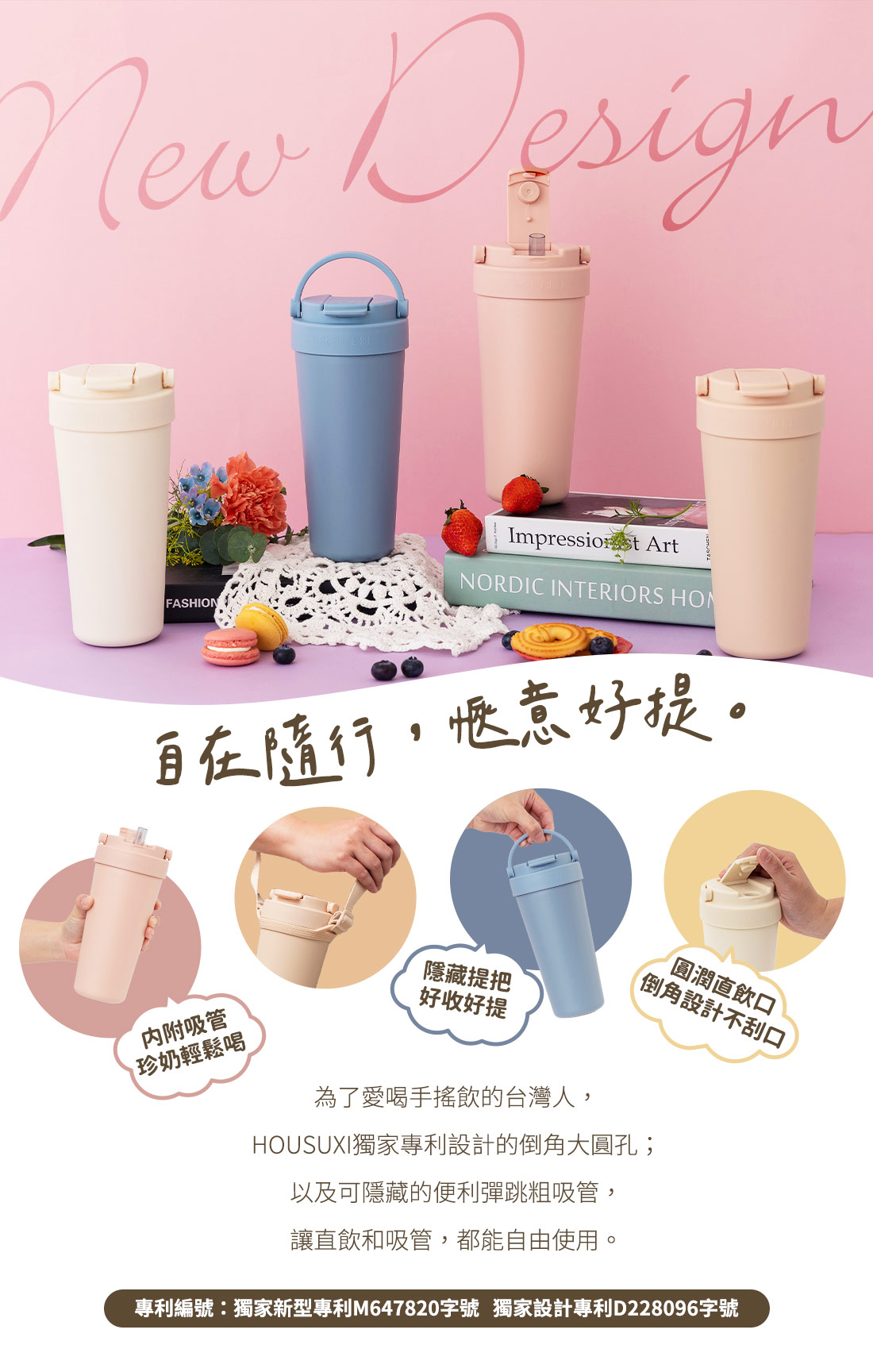 獨家專利杯蓋設計,配件一體成型省下拆卸清洗的煩惱,杯口吸管+直飲經典雙飲設計,4cm隱藏手拎提把,便攜提著走!