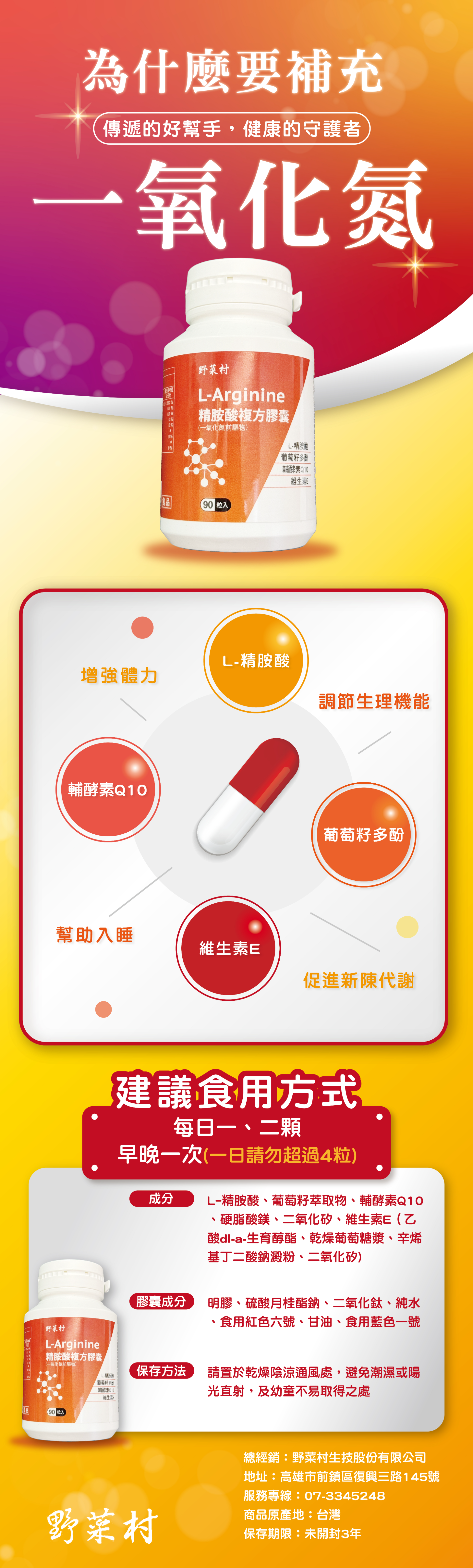 成分:L-精胺酸、葡萄籽萃取物、輔酵素Q10、硬脂酸鎂、二氧化矽、維生素E(乙酸dl-a-生育醇酯、乾燥葡萄糖漿、辛烯基丁二酸鈉澱粉、二氧化矽)
