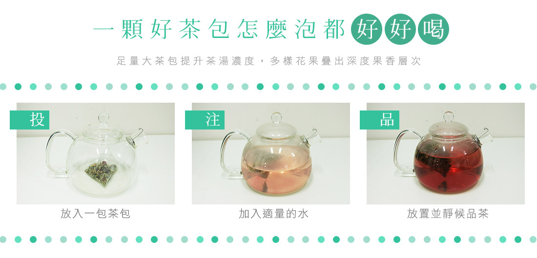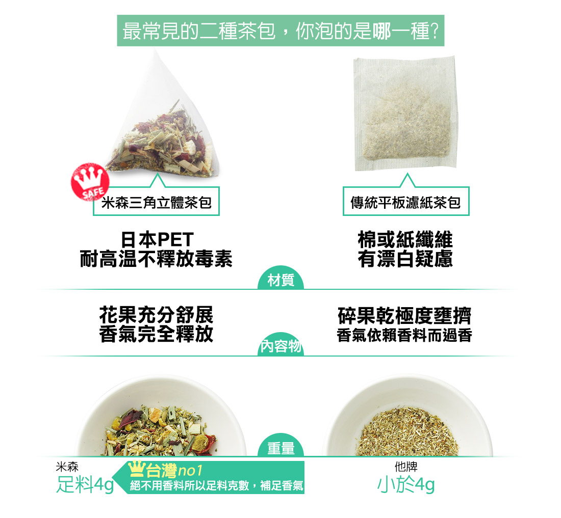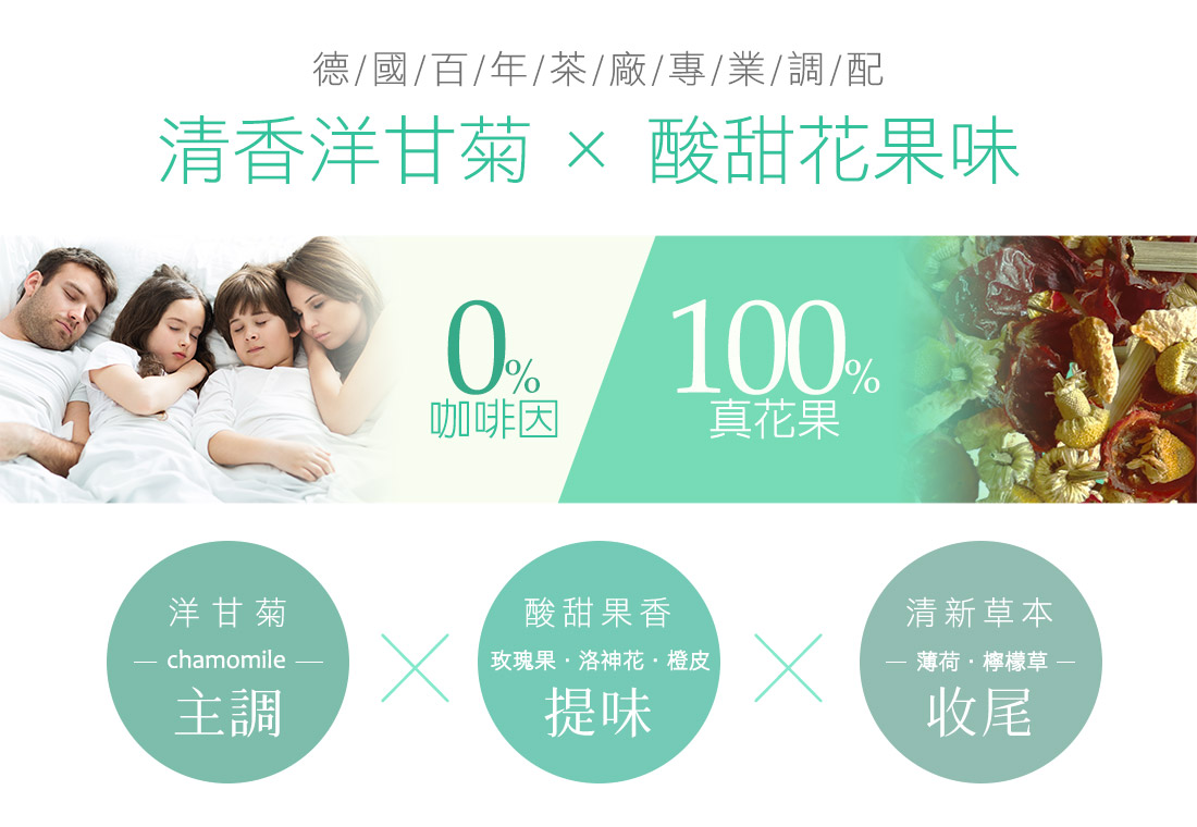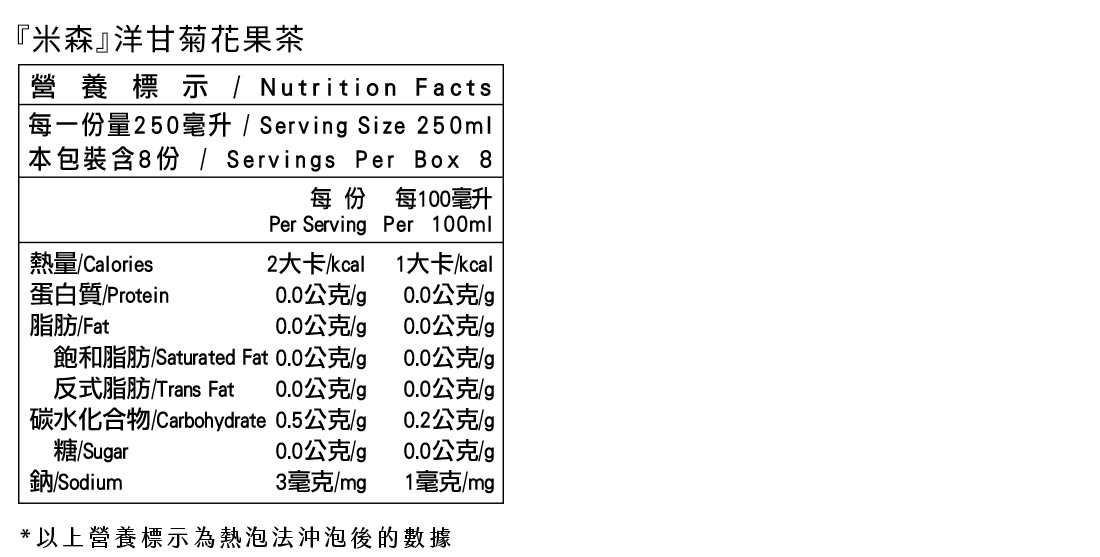 米森為了讓茶也能喝得更真實,特地遠赴德國與專業茶廠合作開發,拒絕人工香料、人工色素調味,堅持喝出無添加的果物口感。以無農藥栽培的洋甘菊為基底,特地加入三種不同的酸甜花果~玫瑰果、洛神花及橙皮來增加酸甜口感的層次,並調入檸檬草及薄荷來提升清新的香氣,並以足量大茶包提升茶湯濃度,產生更多的果香層次。