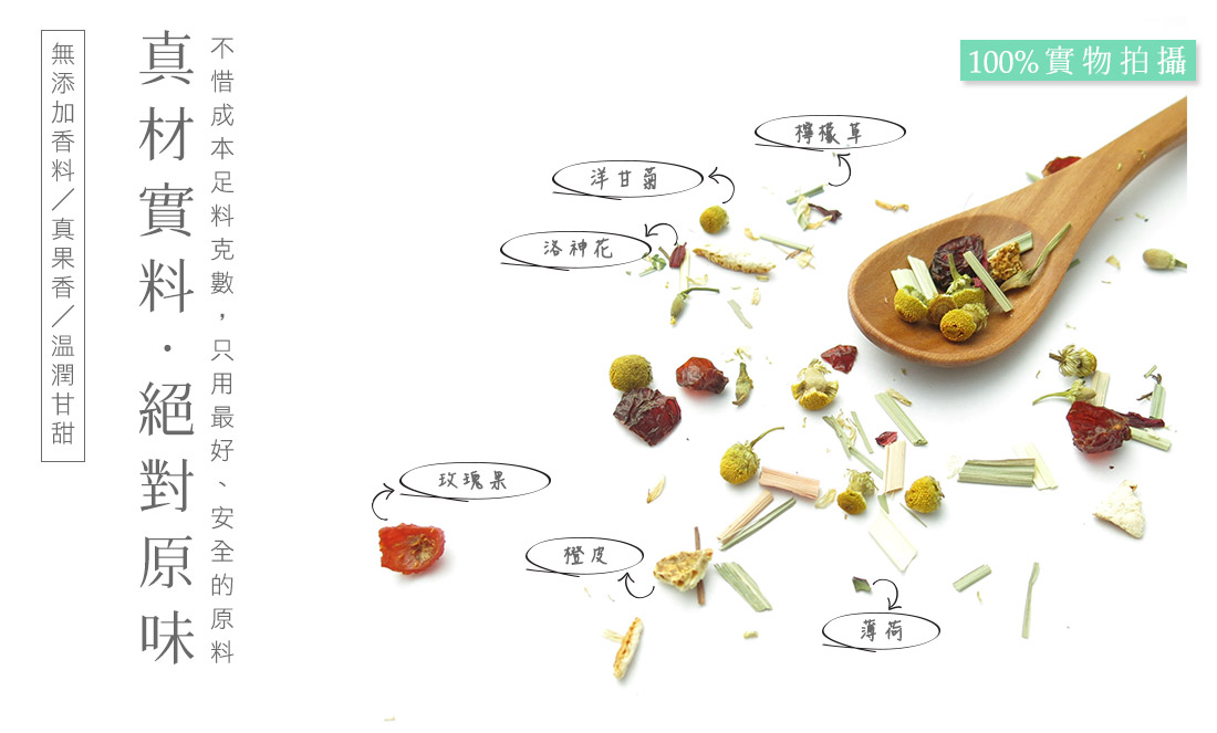 原料:玫瑰果、洋甘菊、橙皮、檸檬草、洛神花、薄荷