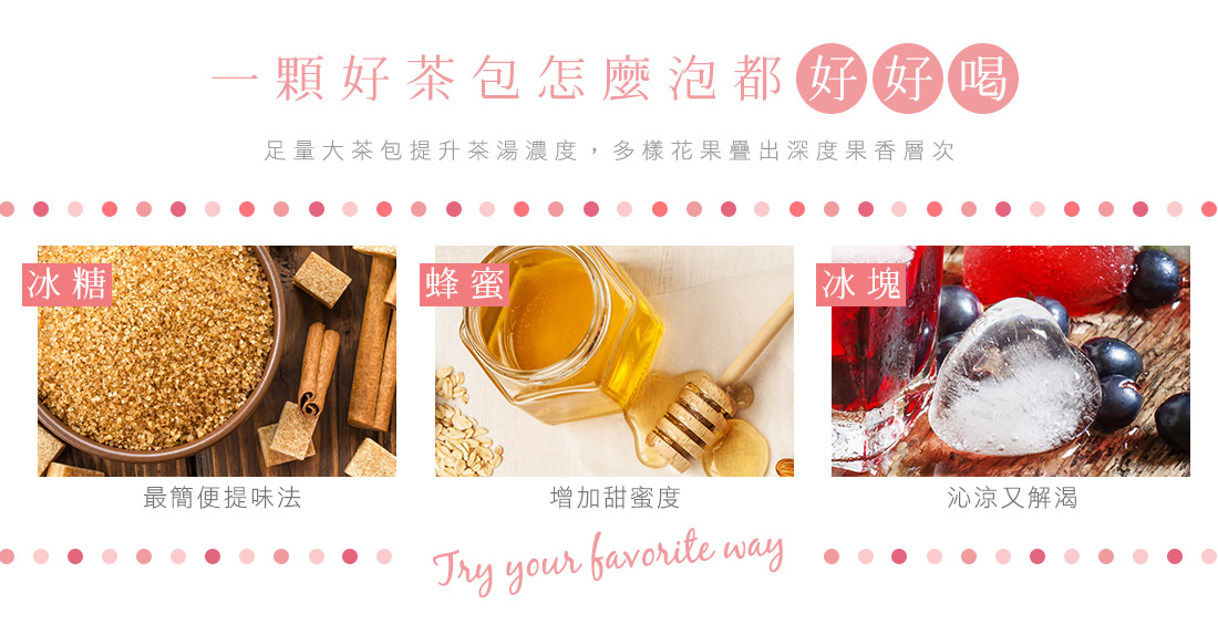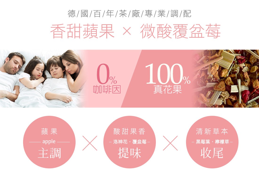 原料:蘋果丁、洛神花、玫瑰果、檸檬草、黑莓葉、覆盆莓果粒