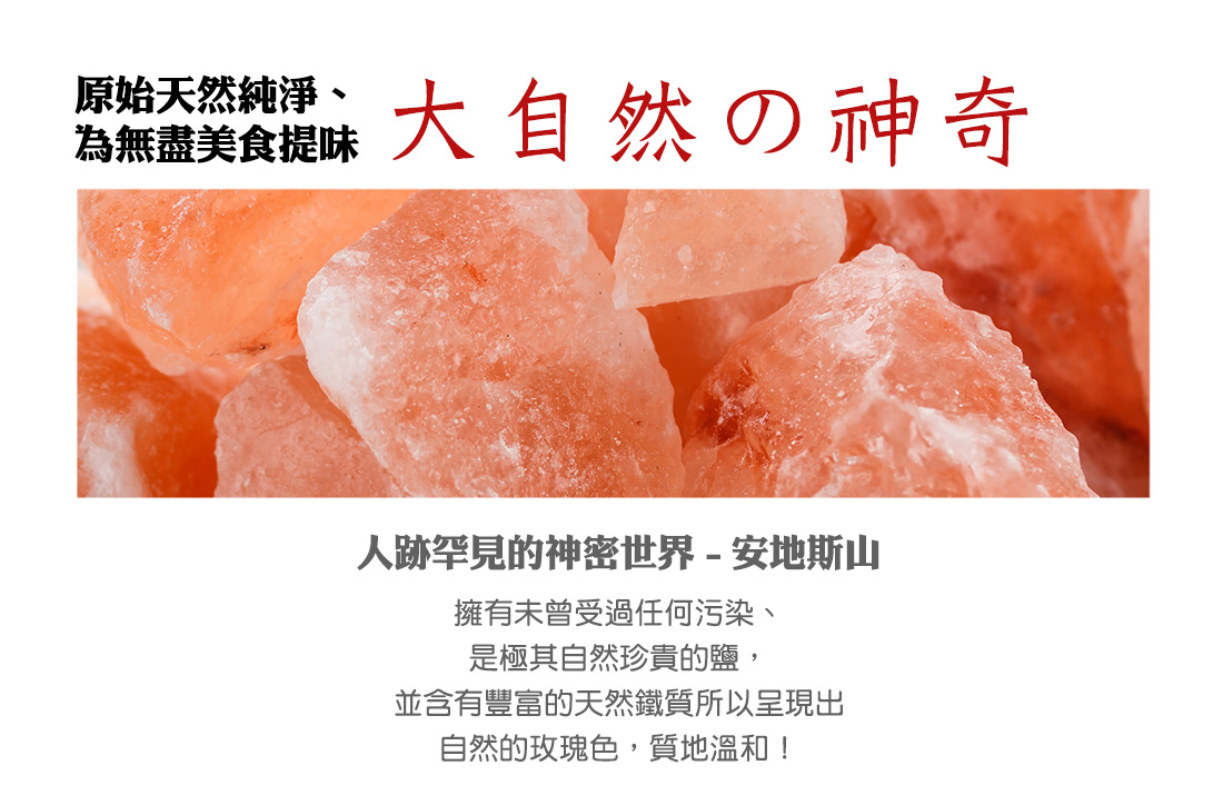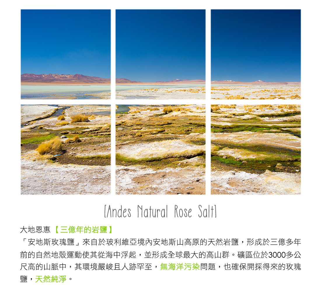 「安地斯玫瑰鹽」來自於玻利維亞境內安地斯山高原的天然岩鹽,形成於三億多年前的自然地殼運動使其從海中浮起,並形成全球最大的高山群。礦區位於3000多公尺高的山脈中,其環境嚴峻且人跡罕至,無海洋污染問題,也確保開採得來的玫瑰鹽,天然純淨。