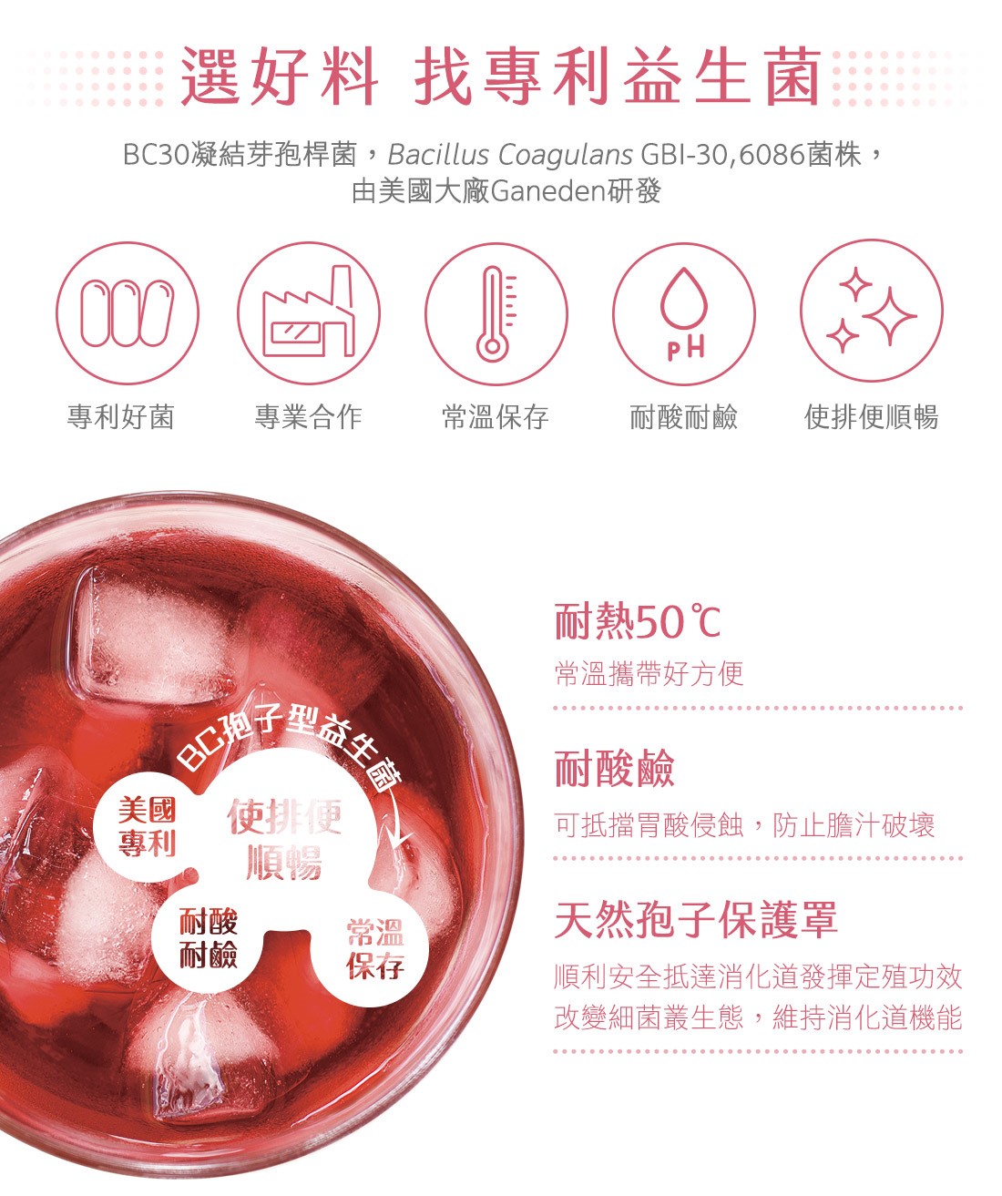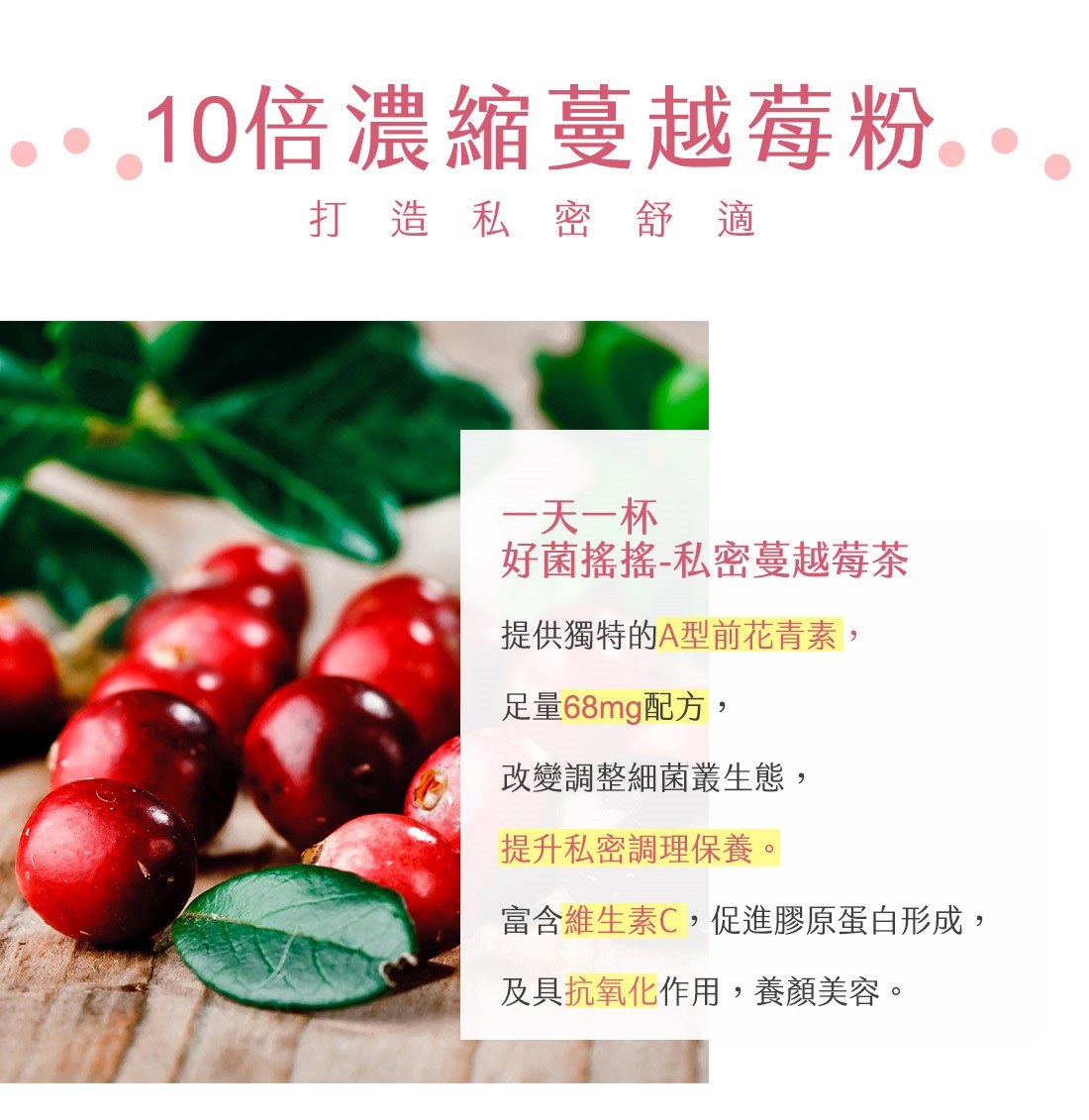 米森選用美國大廠研發BC30凝結芽孢桿菌,其專利好菌耐酸鹼及高溫,可以順利抵達腸道發揮定殖功效,再搭配10倍濃縮蔓越莓粉,足量68mg A型前花青素,改變調整細菌叢生態,提升私密調理保養;富含維生素C,促進膠原蛋白形成,抗氧化作用,養顏美容。