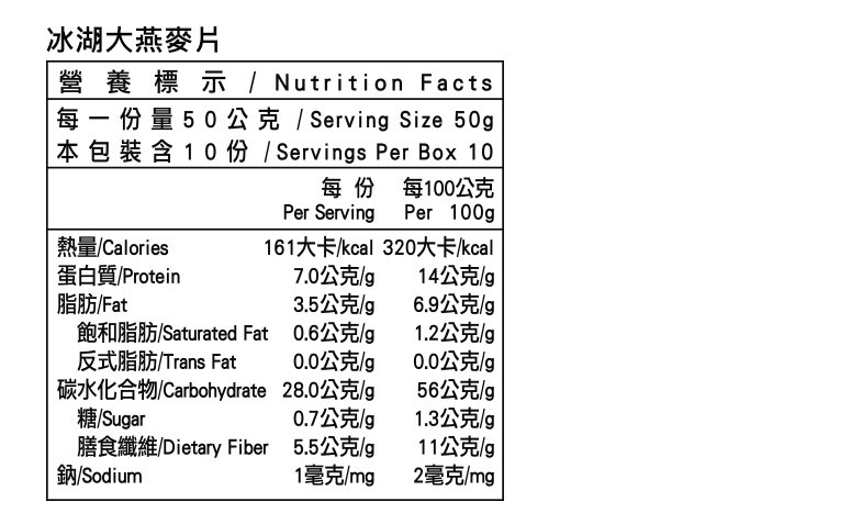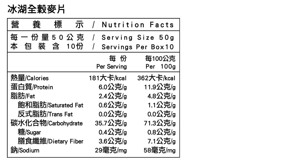 成分:大燕麥片、黑麥片、小麥片、玉米脆片(玉米/非基因改造、砂糖、海鹽、葡萄糖漿)