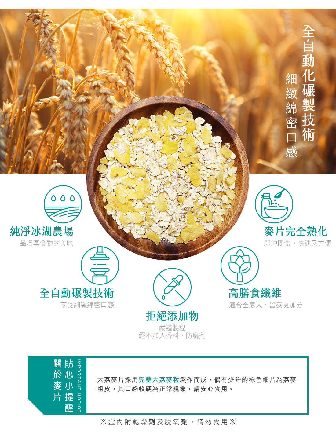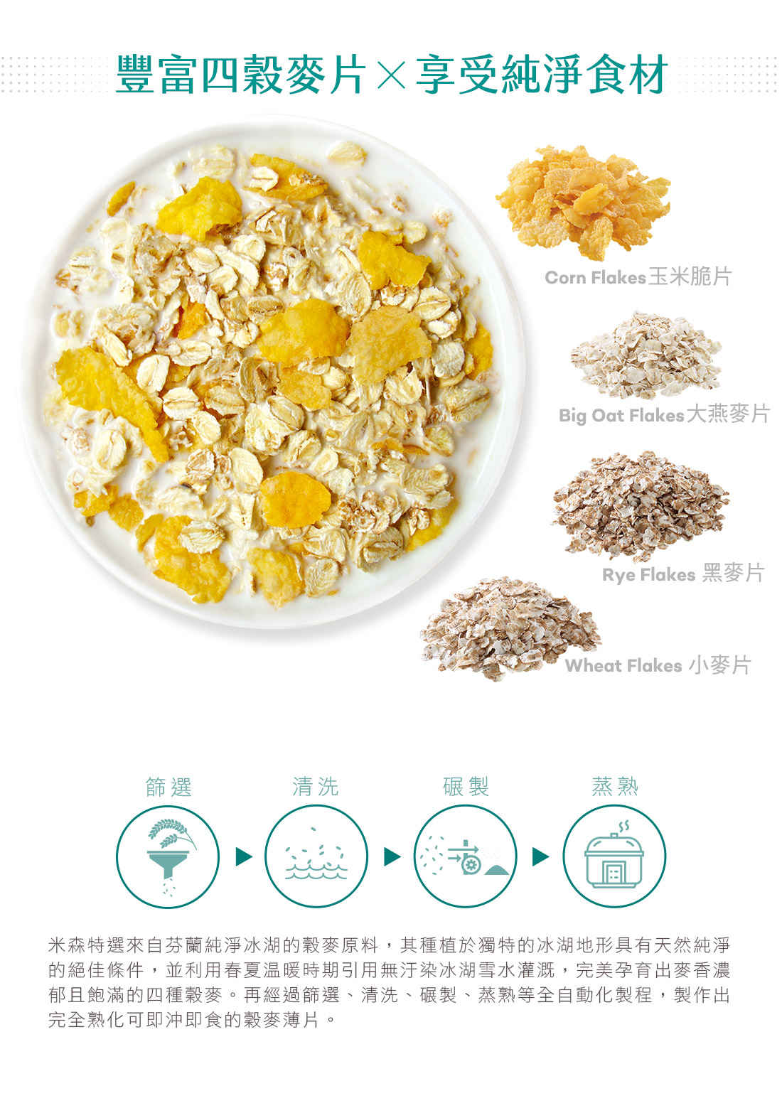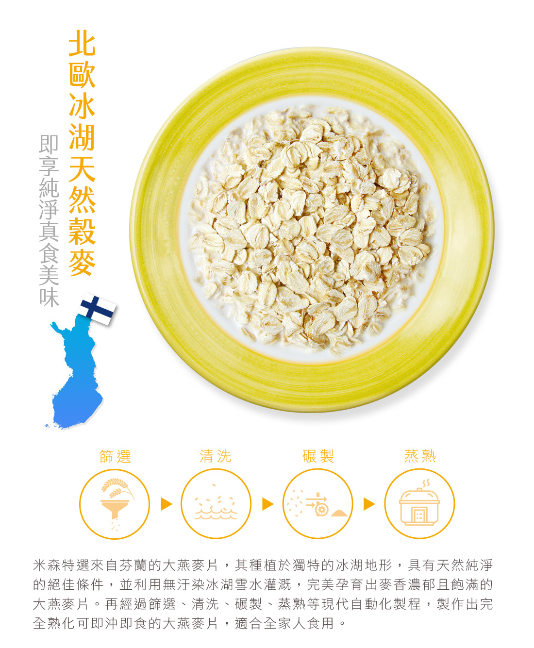 - 米森特選來自芬蘭的冰湖大燕麥片原料,其種植於獨特的冰湖地形,具有天然純淨的絕佳條件,並利用春夏溫暖時期引用無汙染冰湖雪水灌溉,完美蘊育出麥香濃郁且飽滿的大燕麥。再經過篩選、清洗、碾製、蒸熟等現代自動化製程,製作出完全熟化可即沖即食的有機超薄大燕麥片,適合全家人每天食用。