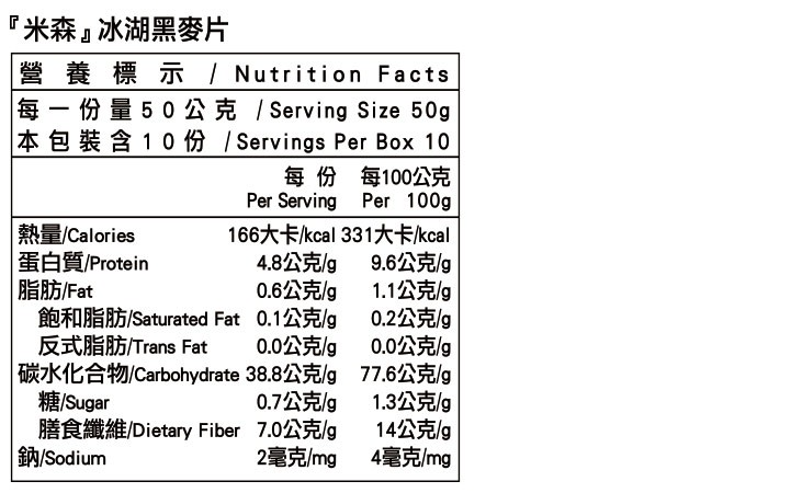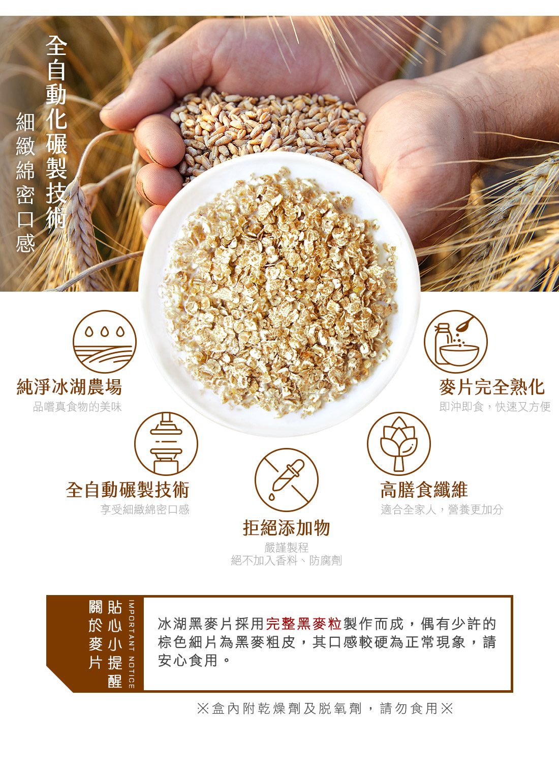 - 米森特選來自芬蘭的冰湖黑麥片原料,其種植於獨特的冰湖地形,具有天然純淨的絕佳條件,並利用春夏溫暖時期引用無汙染冰湖雪水灌溉,完美蘊育出麥香濃郁且飽滿的黑麥。再經過篩選、清洗、碾製、蒸熟等現代自動化製程,製作出完全熟化可即沖即食的超薄黑麥片,適合全家人每天食用。