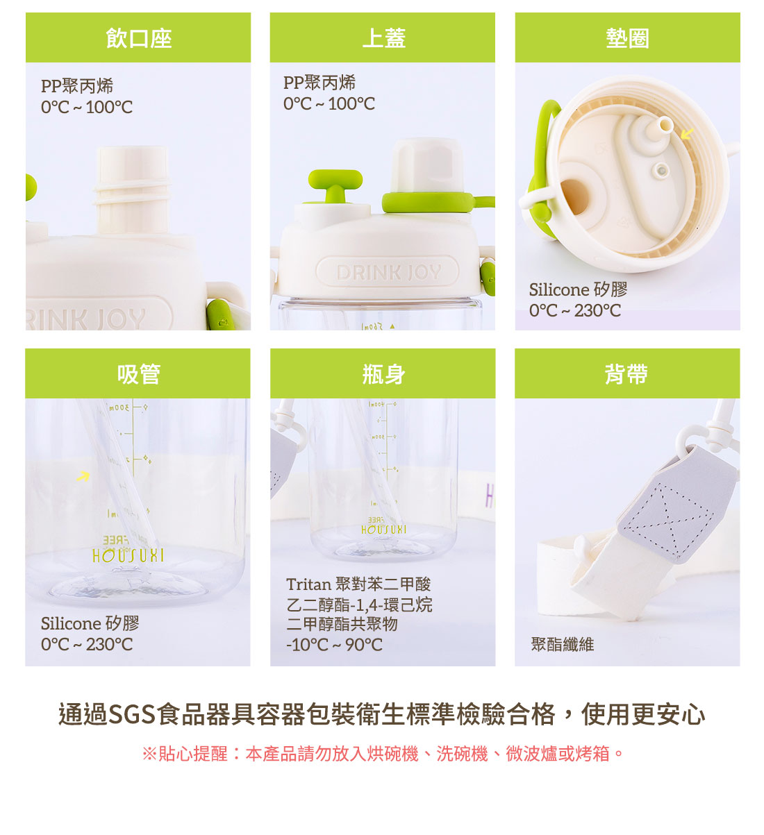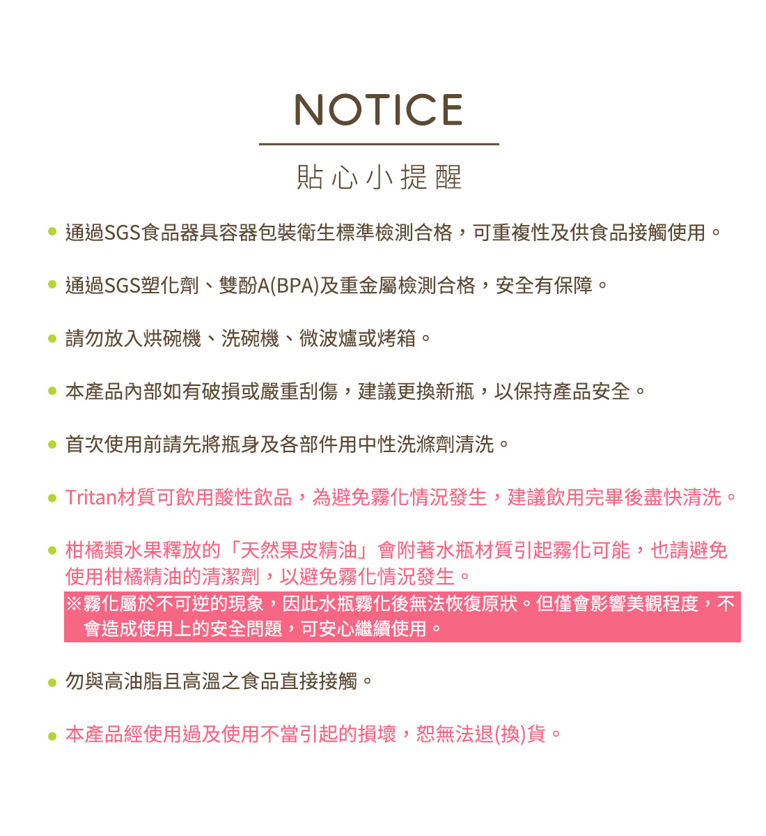 瓶身材質│耐熱溫度:Tritan聚對苯二甲酸乙二醇酯-1,4環己烷二甲醇酯共聚物 ⎯10℃~90℃