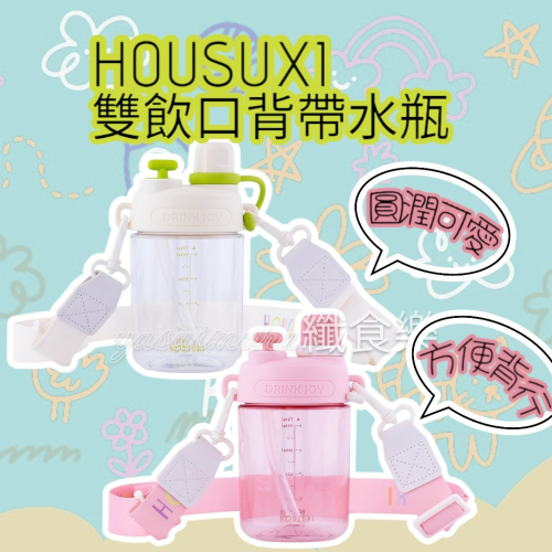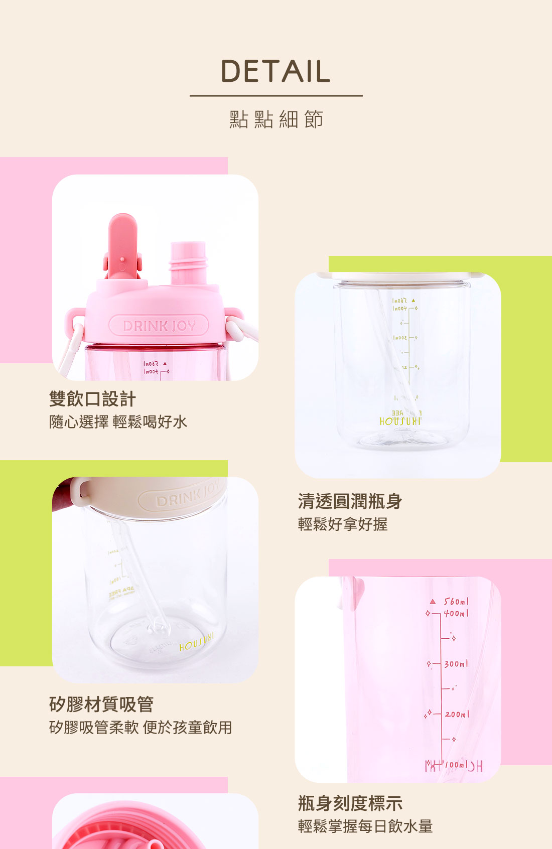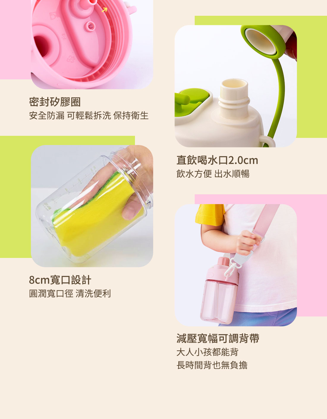 不含雙酚A,材質安全又安心!採用雙飲口設計可隨性補水,2cm的飲水口讓喝水更順暢; 以輕便好拿為設計,搭配可調節式背帶,大小適中,可手提可背舒適出行!