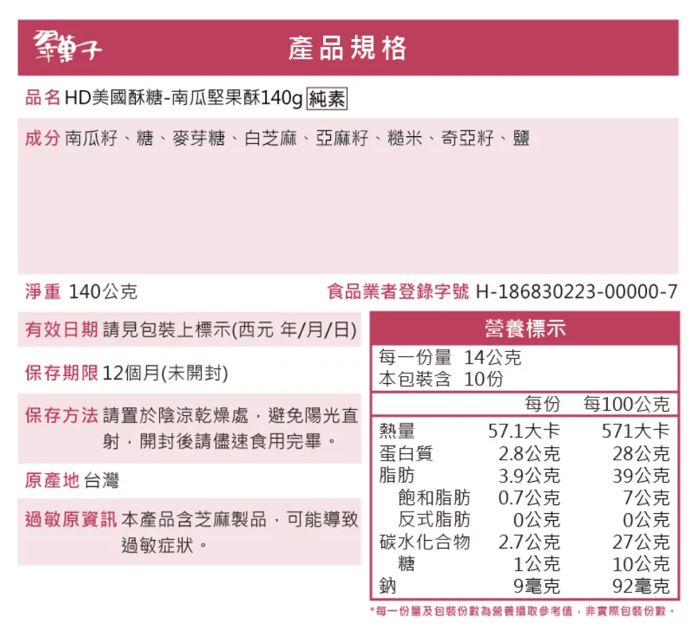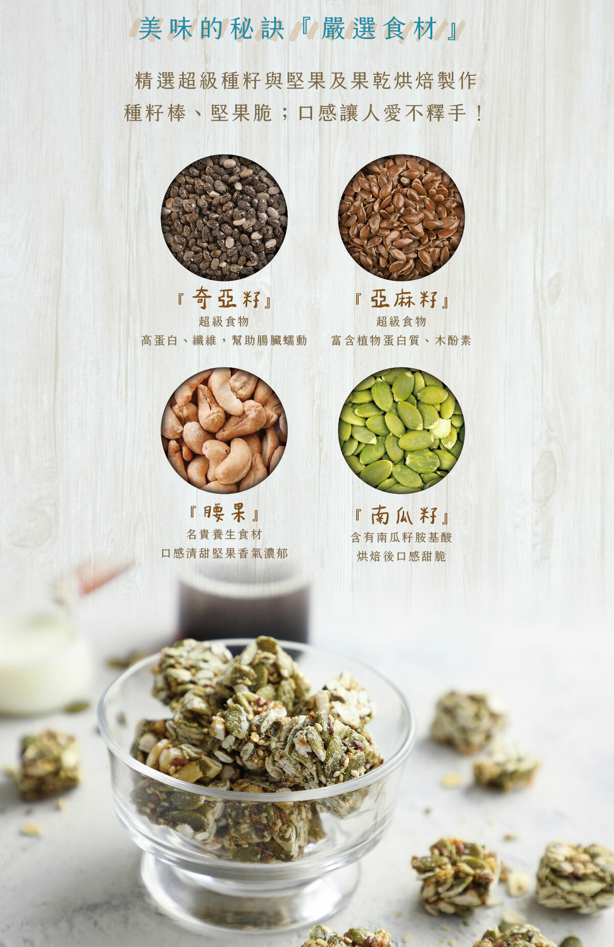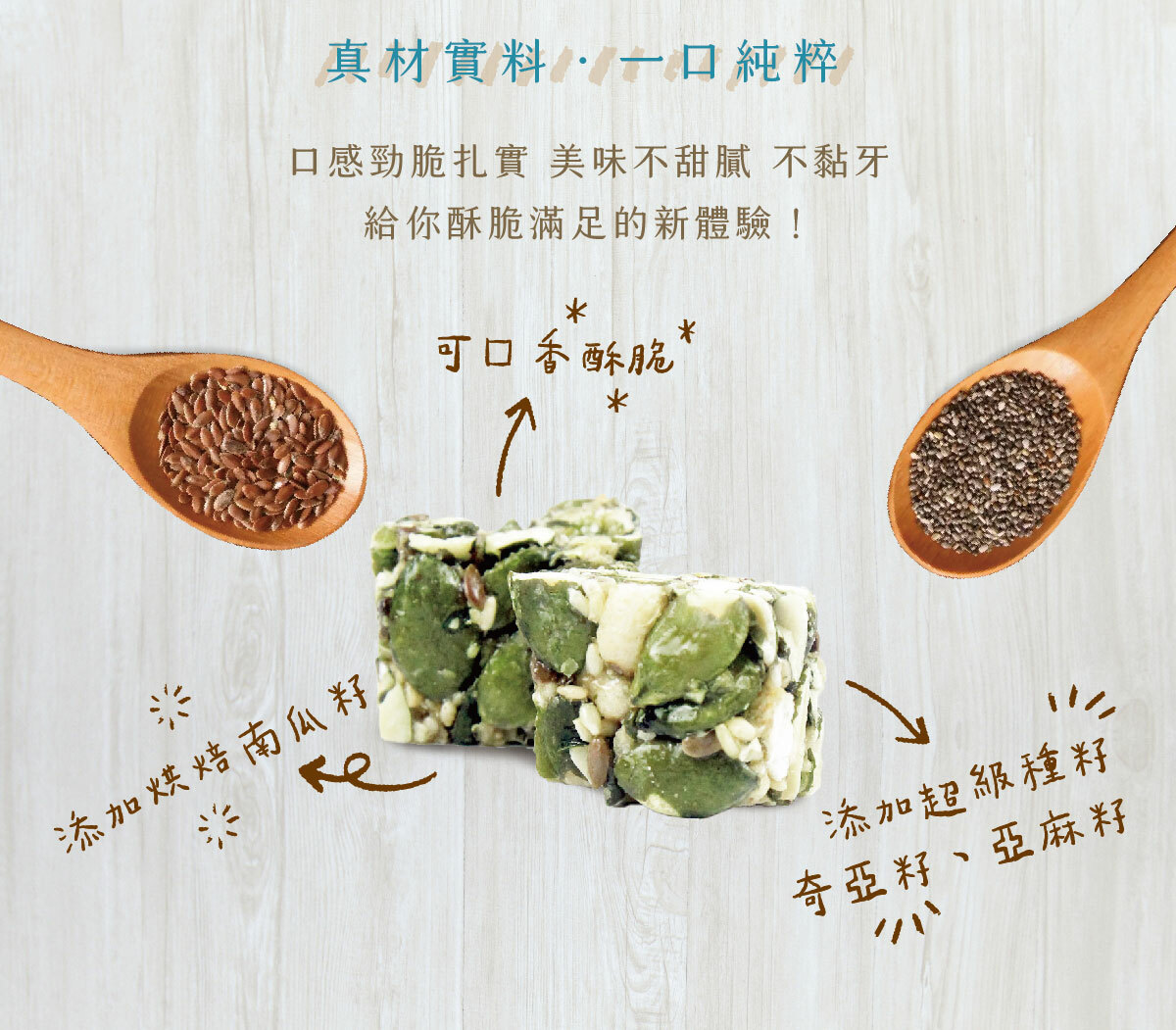 成分:南瓜籽、糖、麥芽糖、白芝麻、亞麻籽、糙米、奇亞籽、鹽