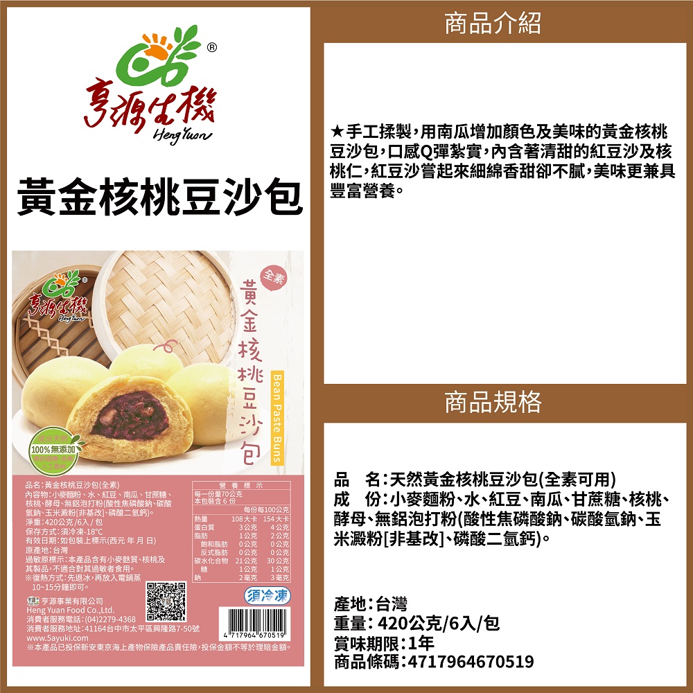 成份:小麥麵粉、水、紅豆、南瓜、甘蔗糖、核桃、酵母、無鋁泡打粉(酸性焦磷酸鈉、碳酸氫鈉、玉米澱粉[非基改]、磷酸二氫鈣)。