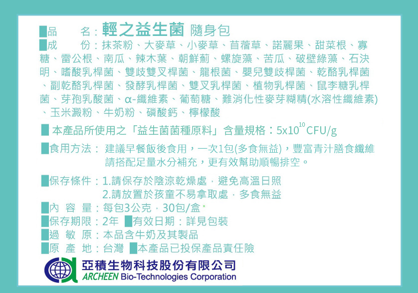 ※ 是真正青汁益生菌 的 輕之益生菌 不甜、無香料,奶素可食