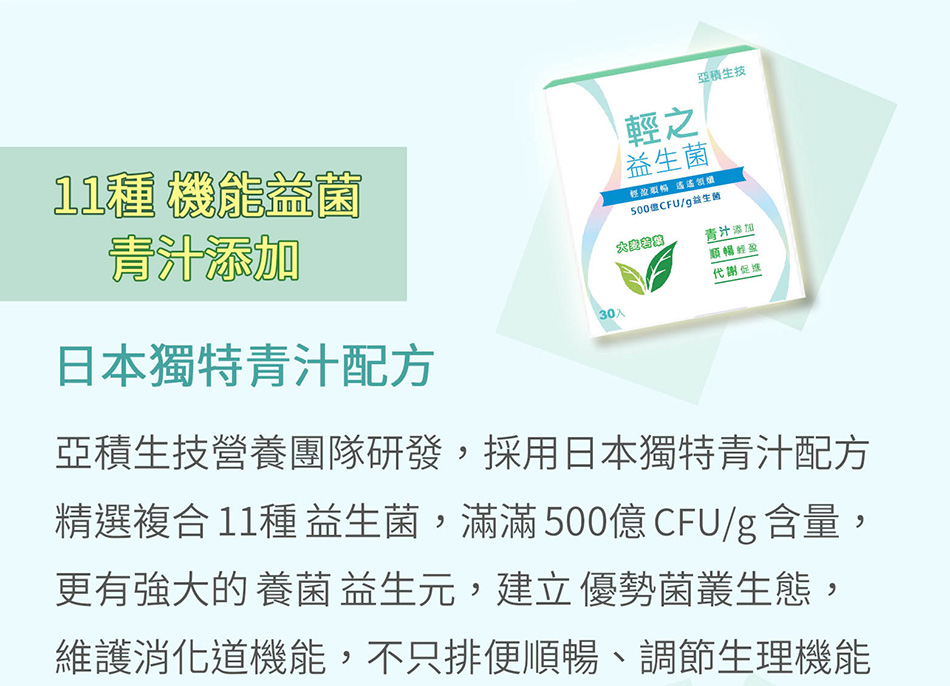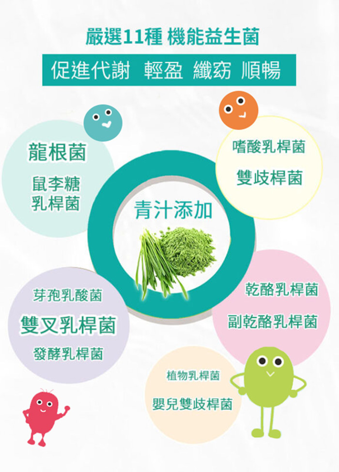 ※ 嚴選11種輕盈好菌,500億益菌,不甜 無負擔,頂級青汁益生菌