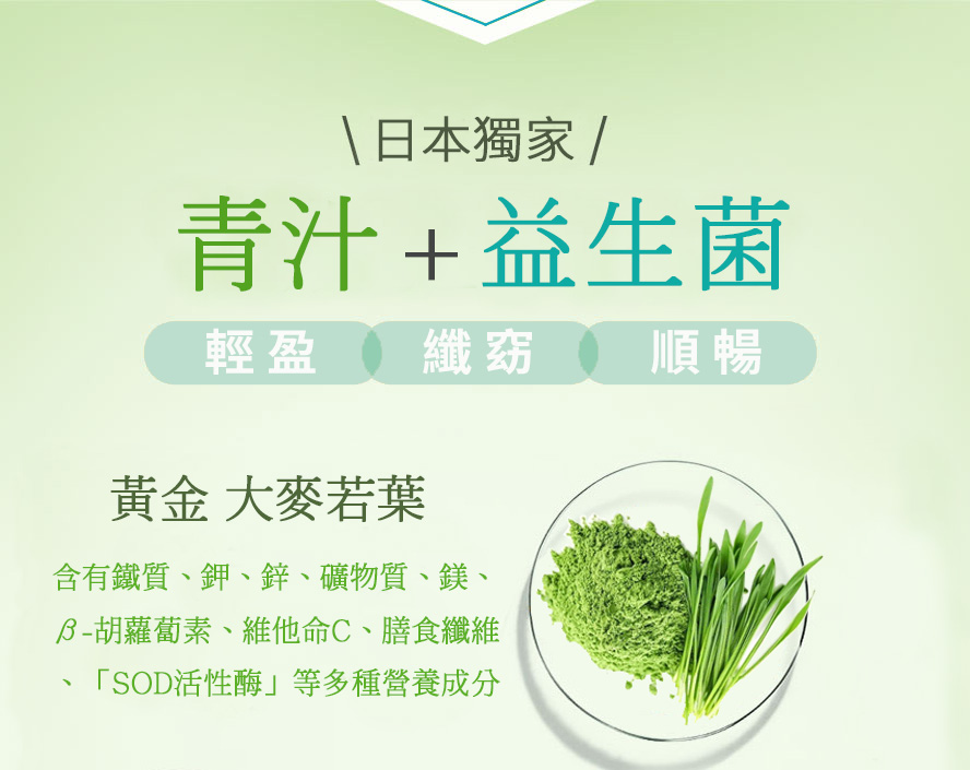 ※ 獨特養菌寡糖+10多種日本青汁配方,完美益生元來源,提升消化道機能,創造完美好環境
