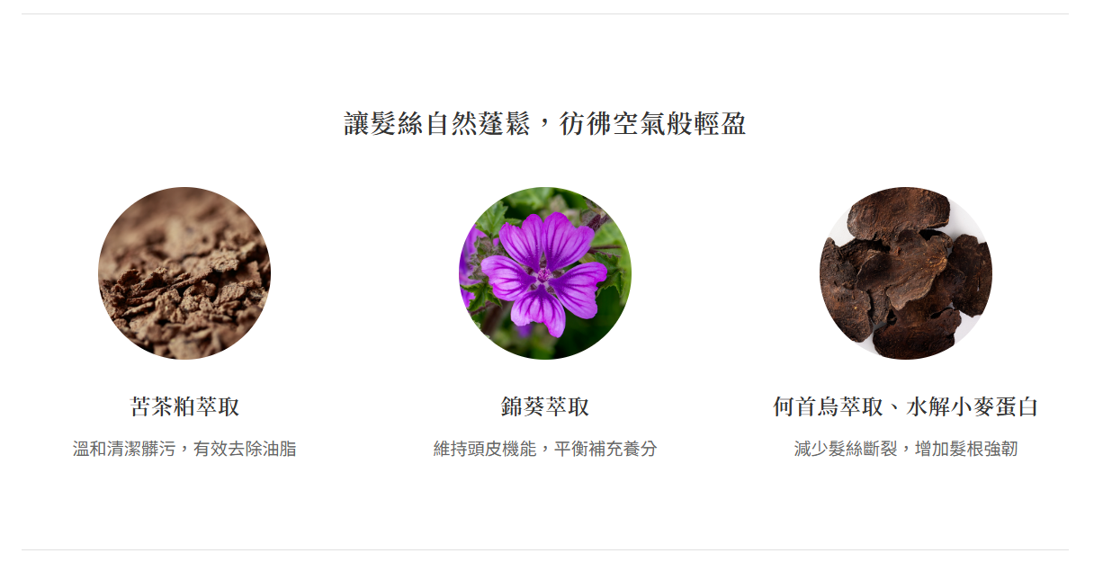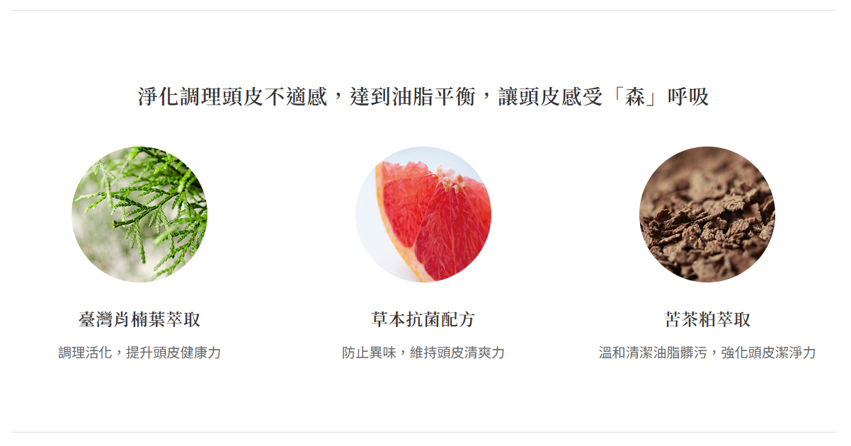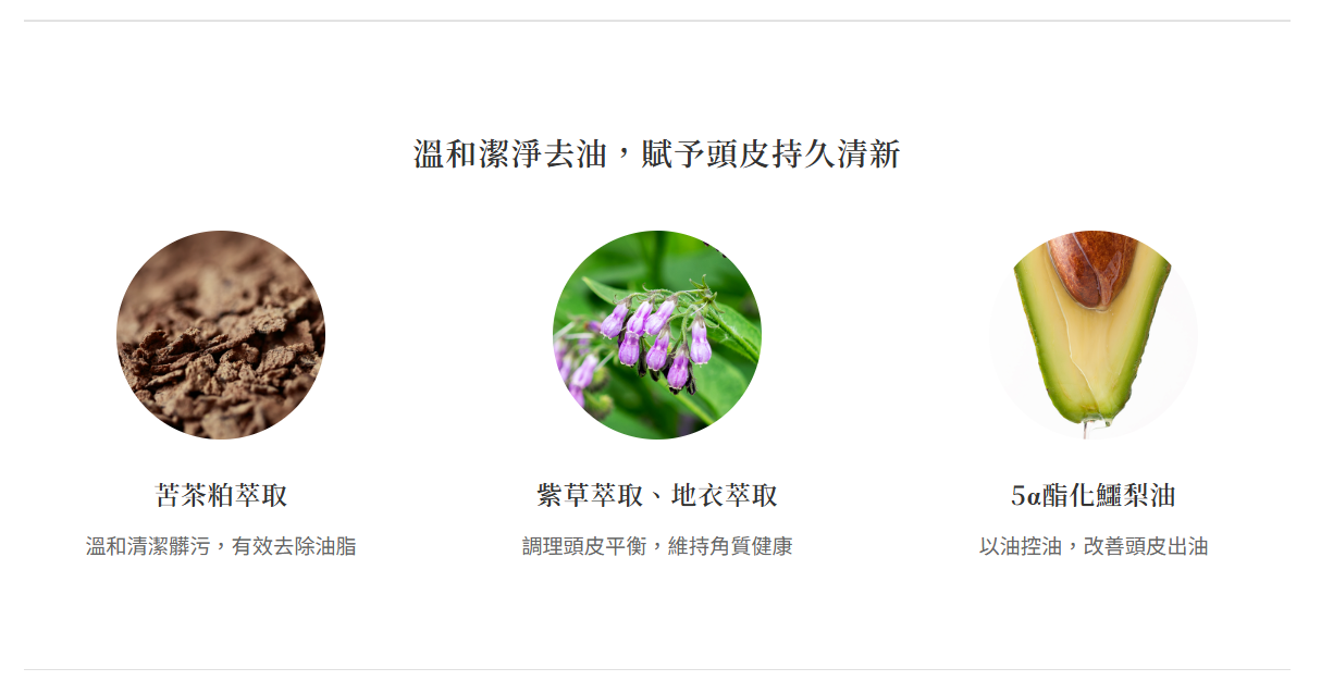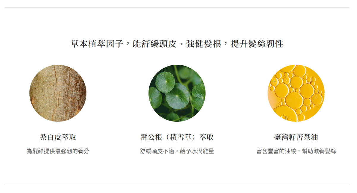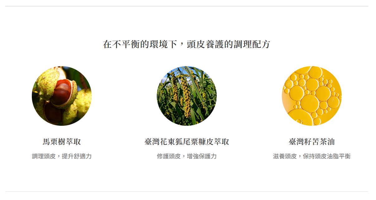 3大植萃成份:馬栗樹萃取、臺灣花東狐尾粟糠皮萃取、綠色發酵油,調理頭皮配方