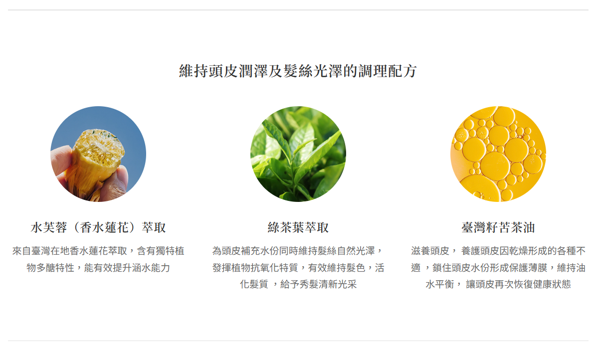 • 臺灣籽苦茶油、臺灣香水蓮花萃取、庫拉索蘆薈萃取|滋養頭皮、調理髮質