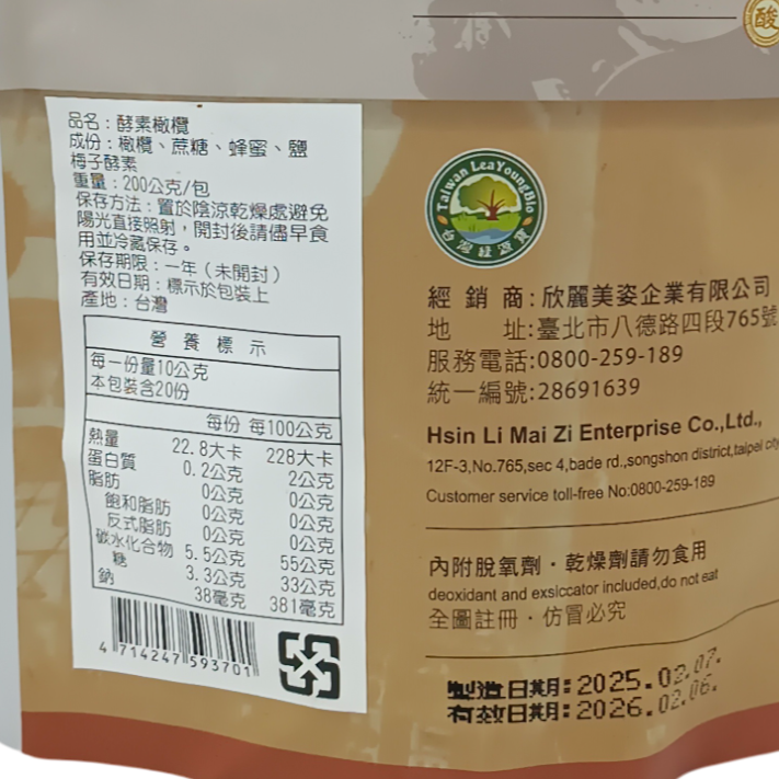 成份:橄欖、蔗糖、蜂蜜、鹽梅子酵素