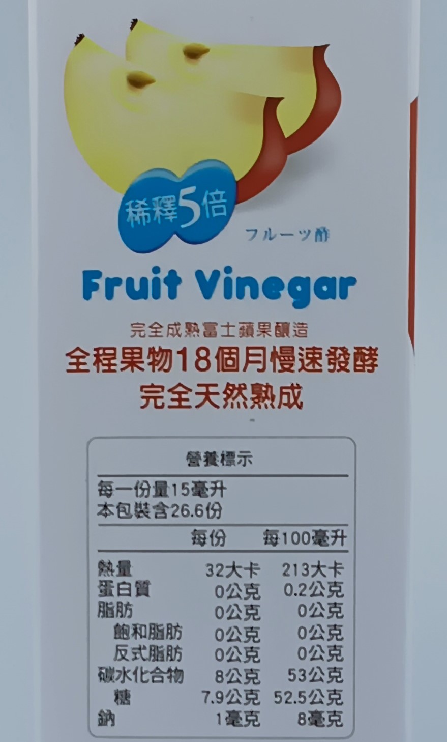 內容物:水、蘋果醋、冰糖、異麥芽寡糖。
