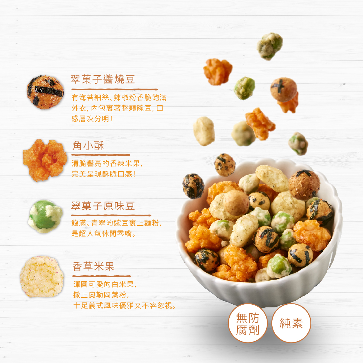 內容物:角小酥、翠菓子原味豆、翠菓子醬燒豆、香草米菓