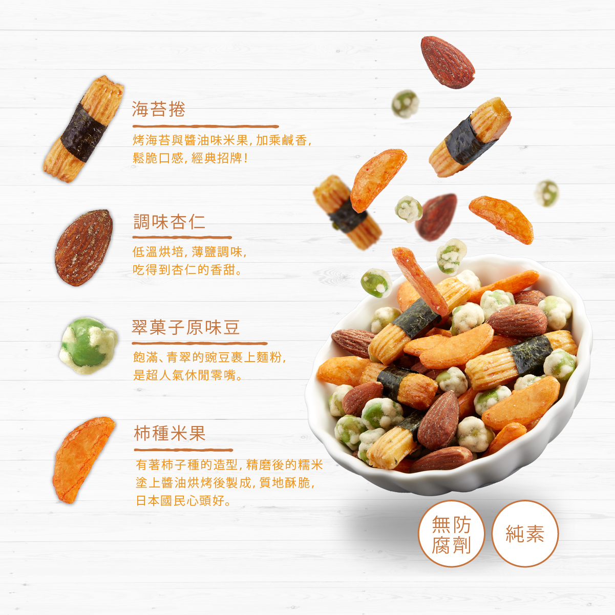 內容物:調味杏仁、調味腰果、海苔捲、翠菓子原味豆