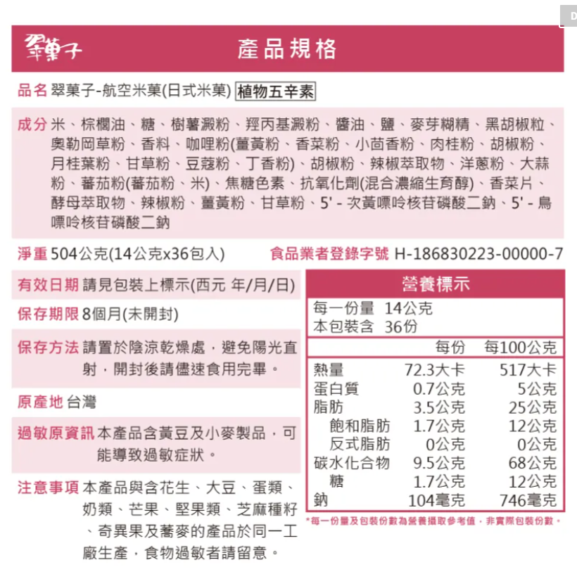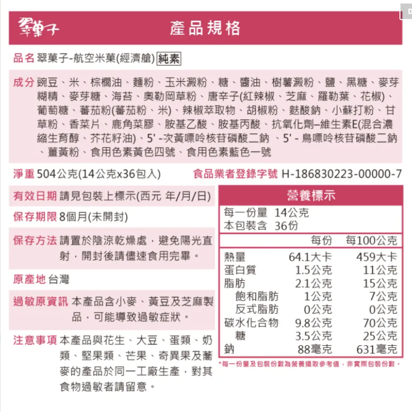 內容物:調味杏仁、翠菓子原味豆、柿種米菓、海苔捲