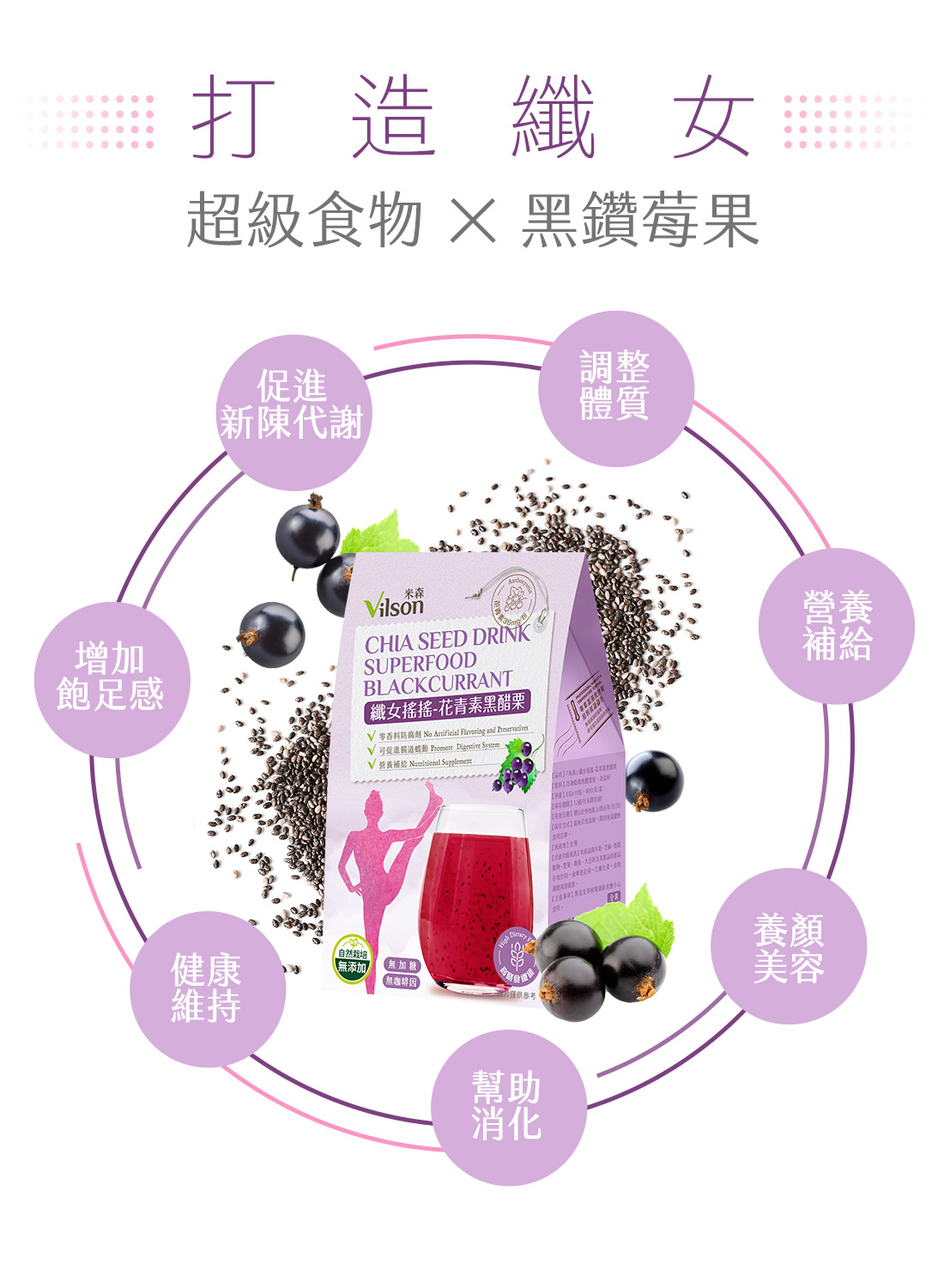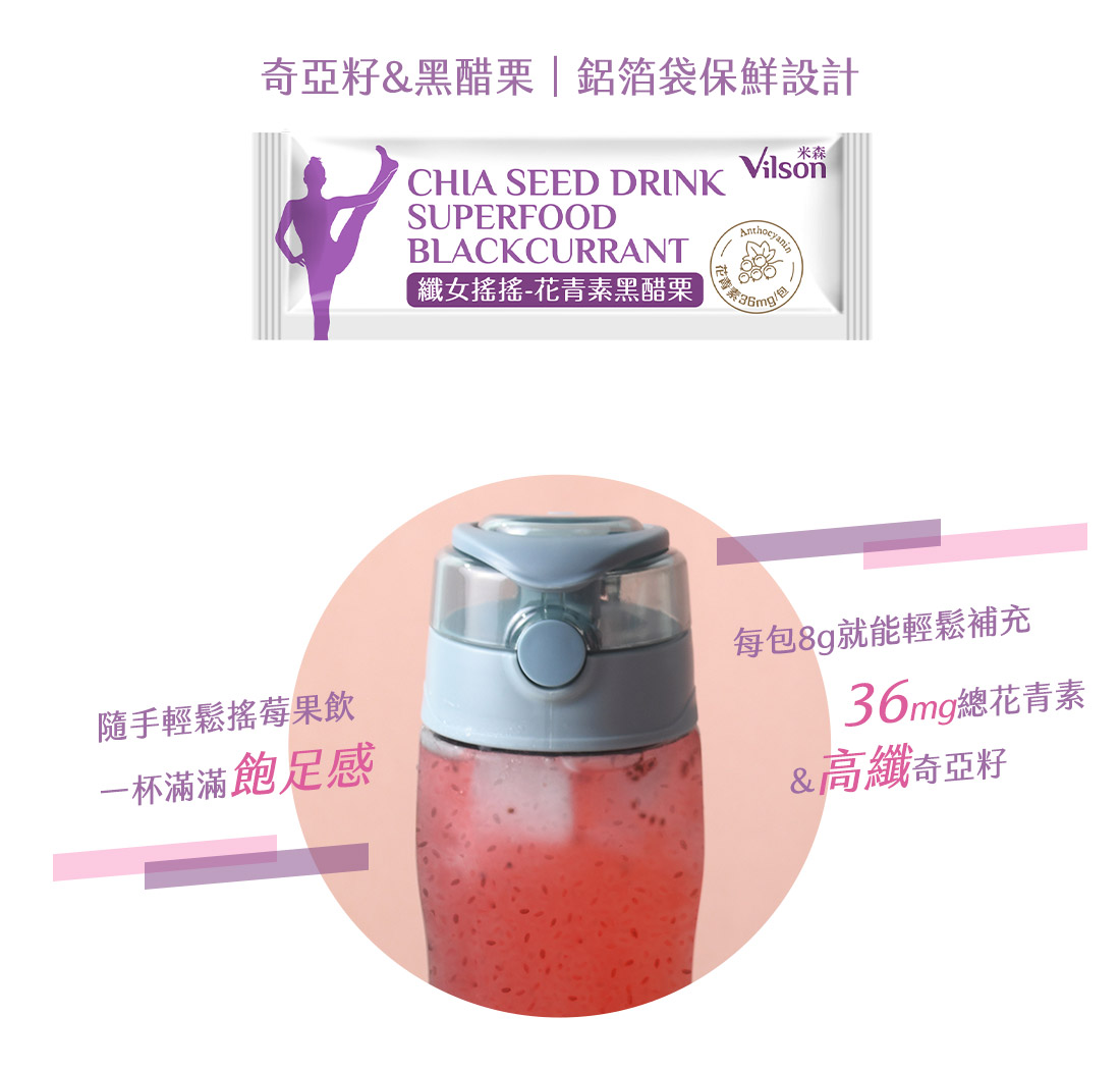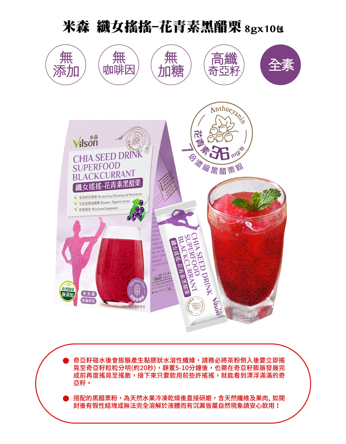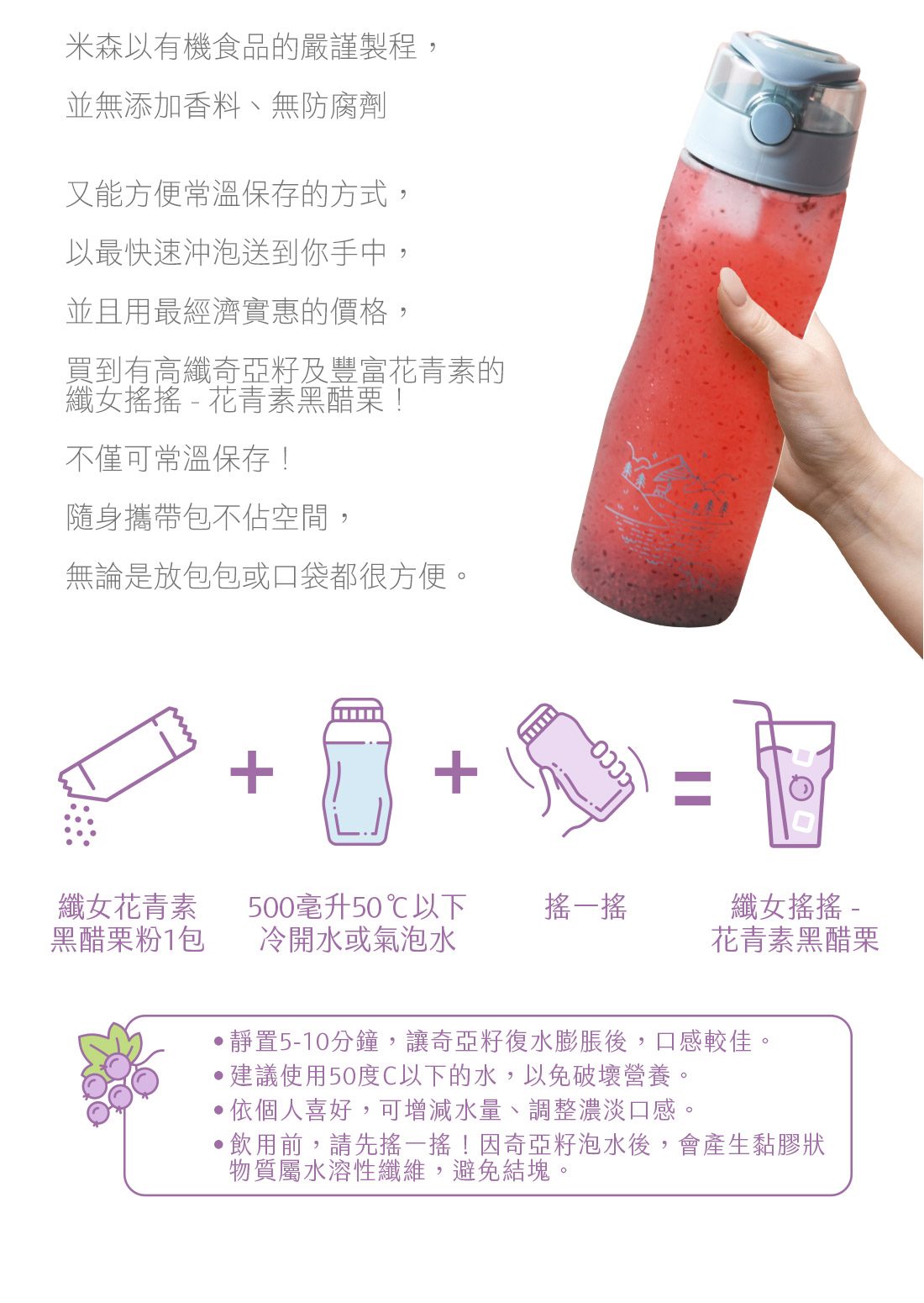 米森選用高纖奇亞籽,營養豐富的超級食物,具有吸附水分的特性,腹水膨脹後可直接食用,增加飽足感,具富含膳食纖維,可促進腸道蠕動,再搭配7倍濃縮黑醋栗粉,堅持無添加,每份36mg配方,提供滿滿花青素,加強營養補給及健康維持,一天一杯調節生理機能,舒適感UP。