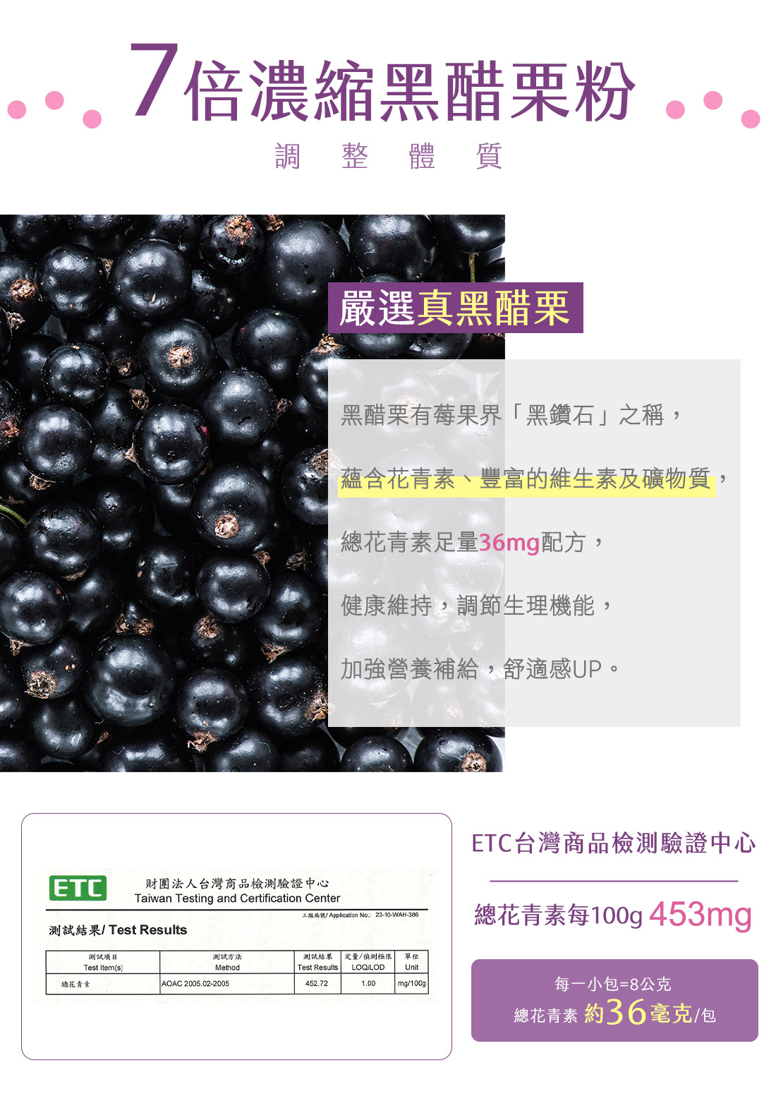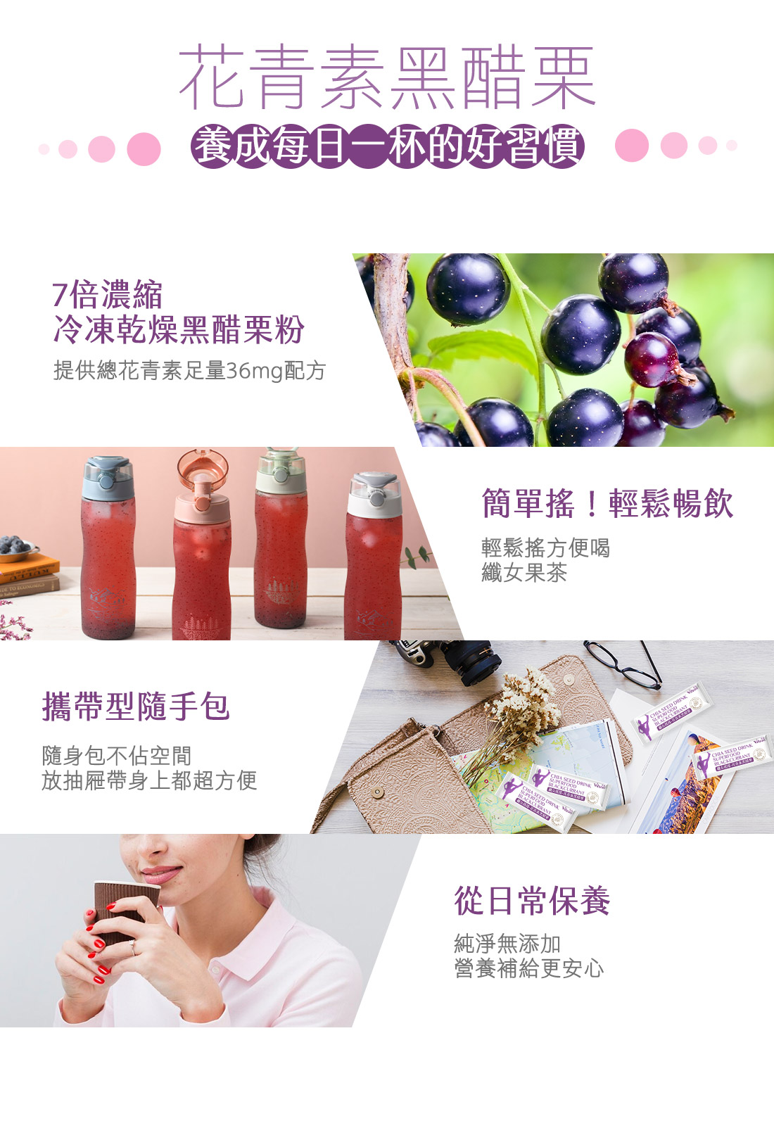 ◆ 7倍濃縮黑醋栗,每份總花青素含36mg,加強營養補給