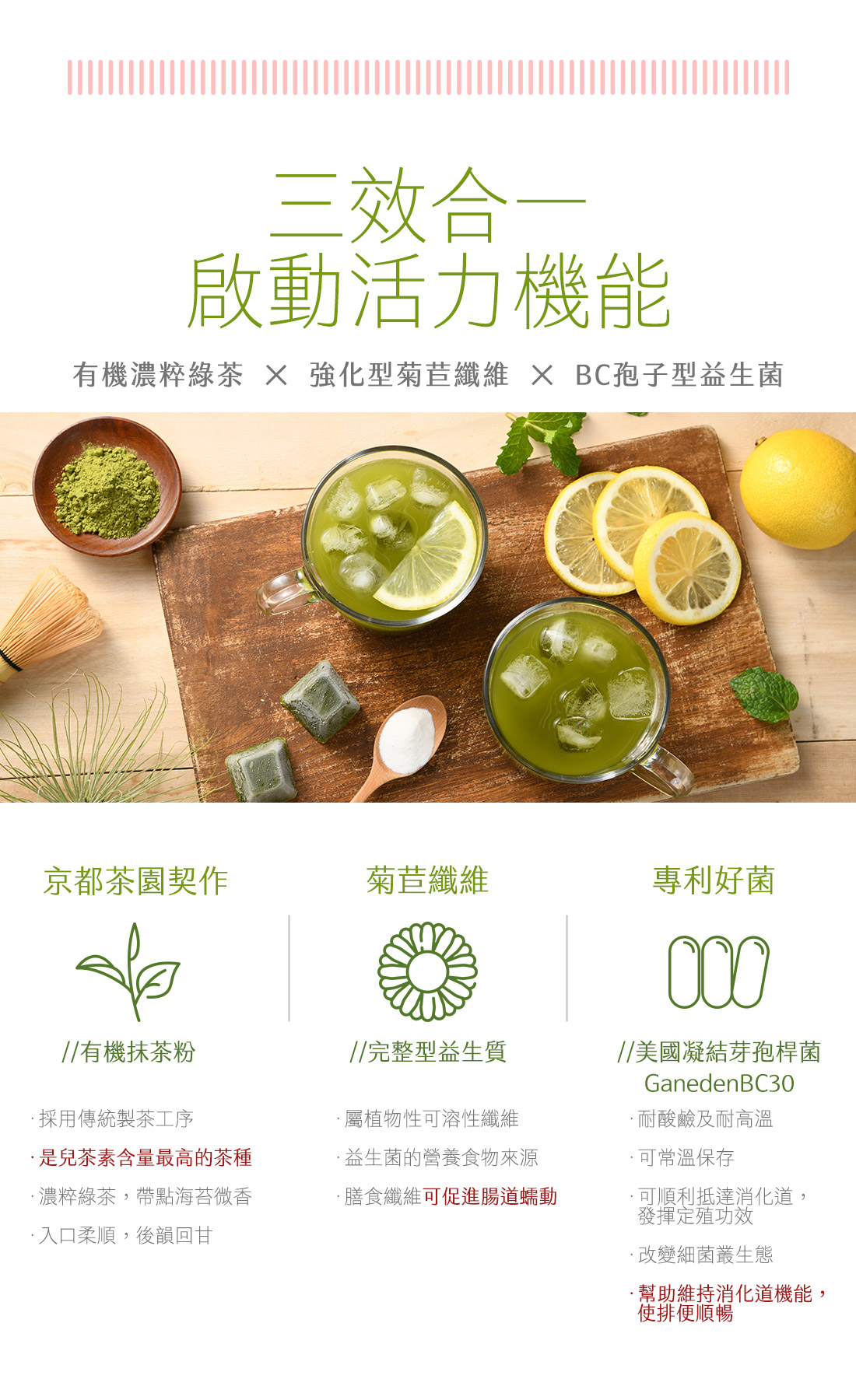 原料:有機抹茶粉(日本-京都)、強化型菊苣纖維(比利時)、BC30凝結芽孢桿菌(菊糖、凝結芽孢桿菌(乳酸菌))(美國)